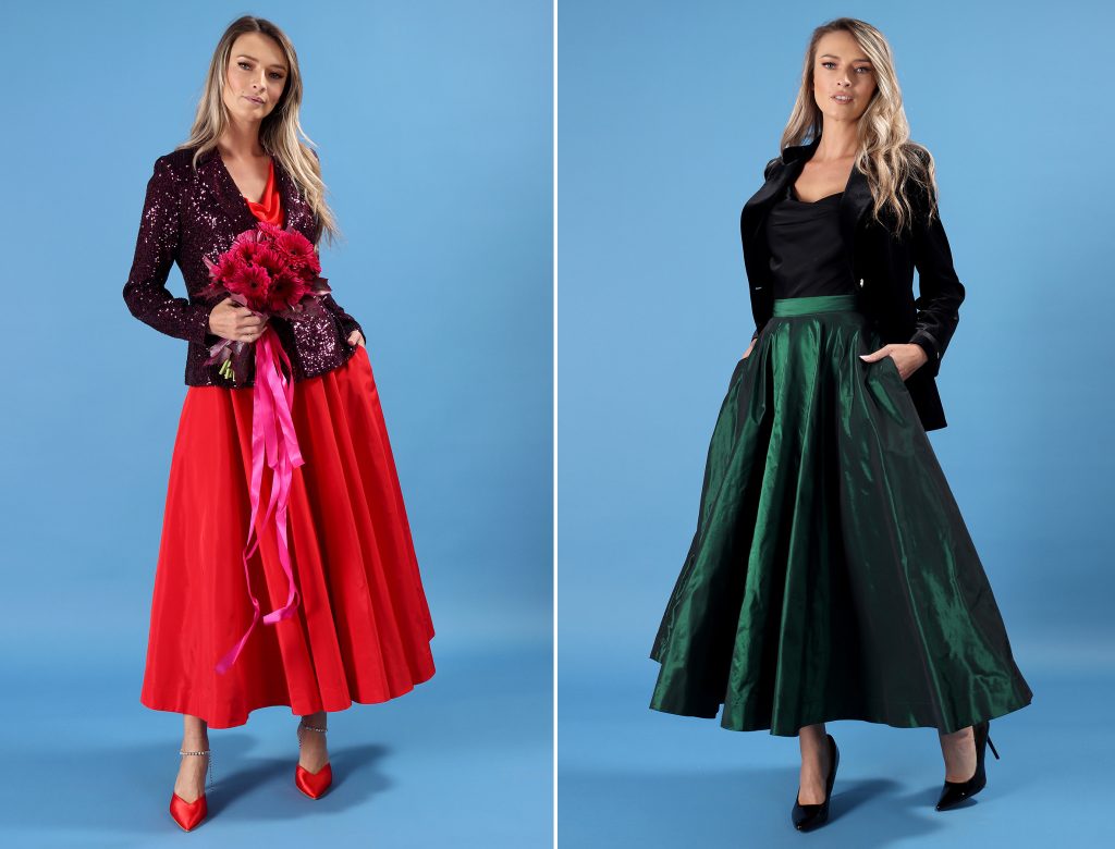 În acest sezon, două culori domină scena: roșul intens, pasional și feminin, și verde pin, adânc și sofisticat. Sunt nuanțele care evocă atmosfera caldă a sărbătorilor și pun în valoare orice ton de piele, aducând un plus de vitalitate și contrast în ținute. Completate de nuanțe precum roșu burgundy, china blue sau mov, aceste culori transformă fiecare ținută într-un simbol al feminității încrezătoare.