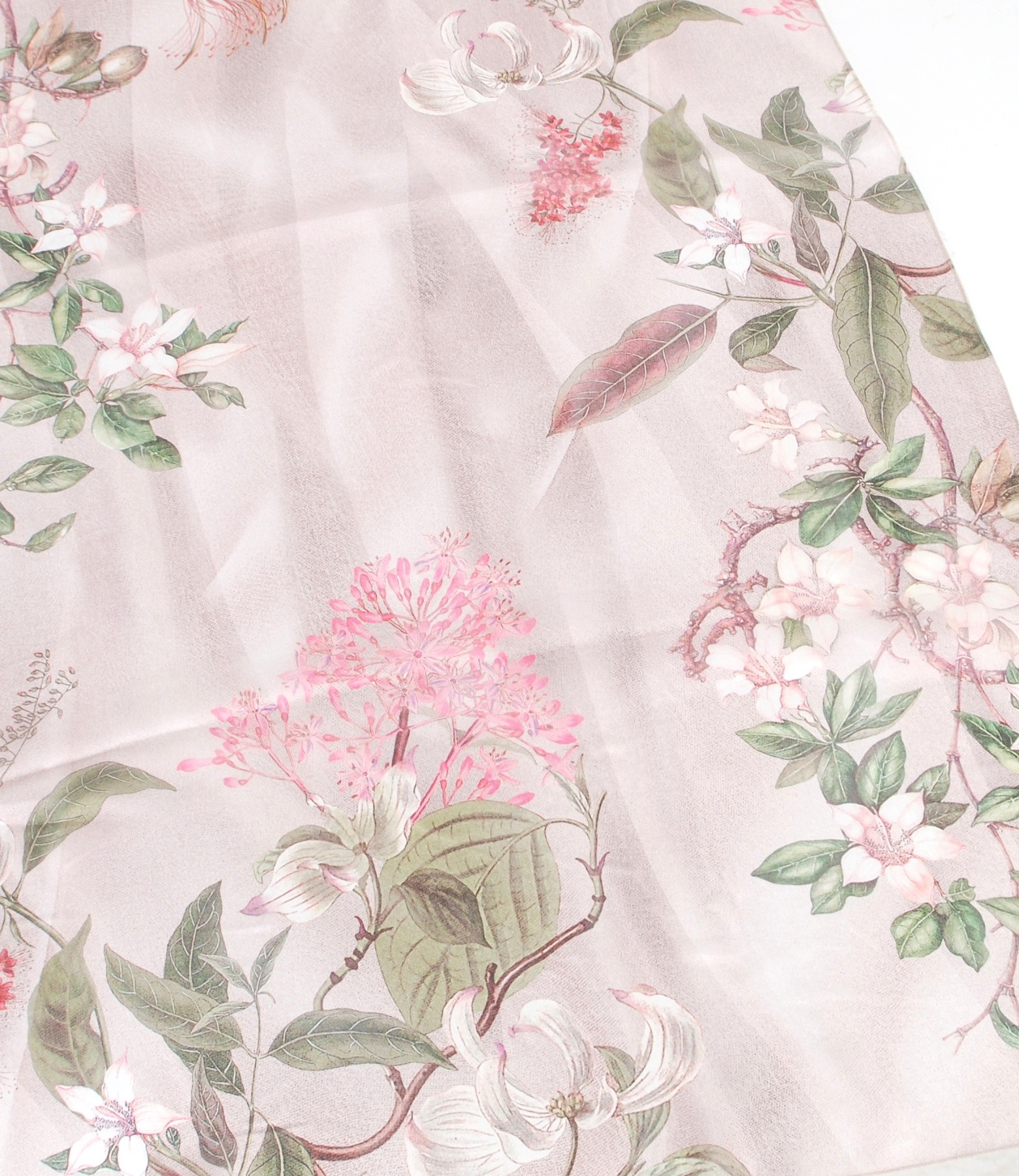 Batic din voal fin de viscoza, imprimat cu motive florale, finisat la masina speciala.