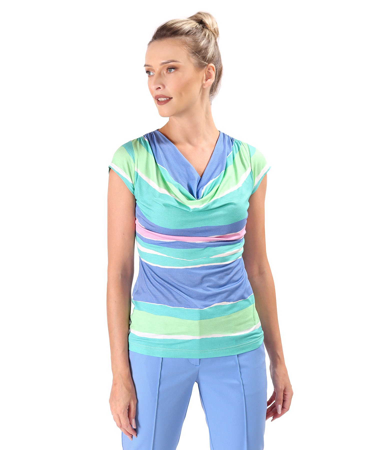 Bluza din jerse elastic imprimat cu dungi cu decolteu in falduri, cu maneci tip aripioara, si cu decolteul in falduri.