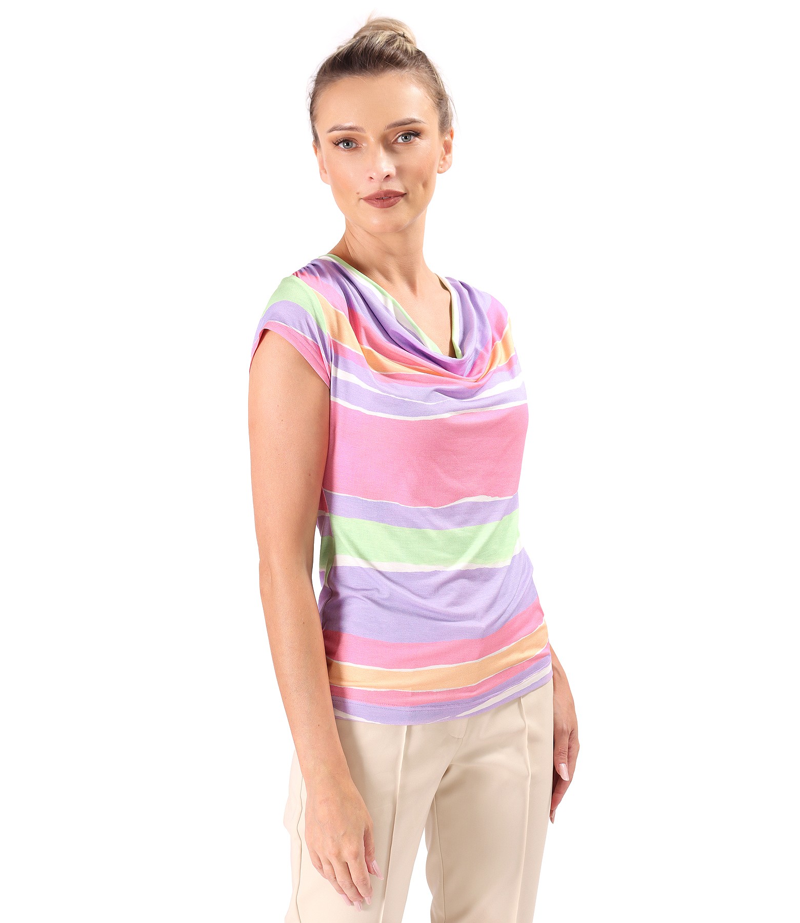 Bluza din jerse elastic imprimat cu dungi cu decolteu in falduri, cu maneci tip aripioara, si cu decolteul in falduri.