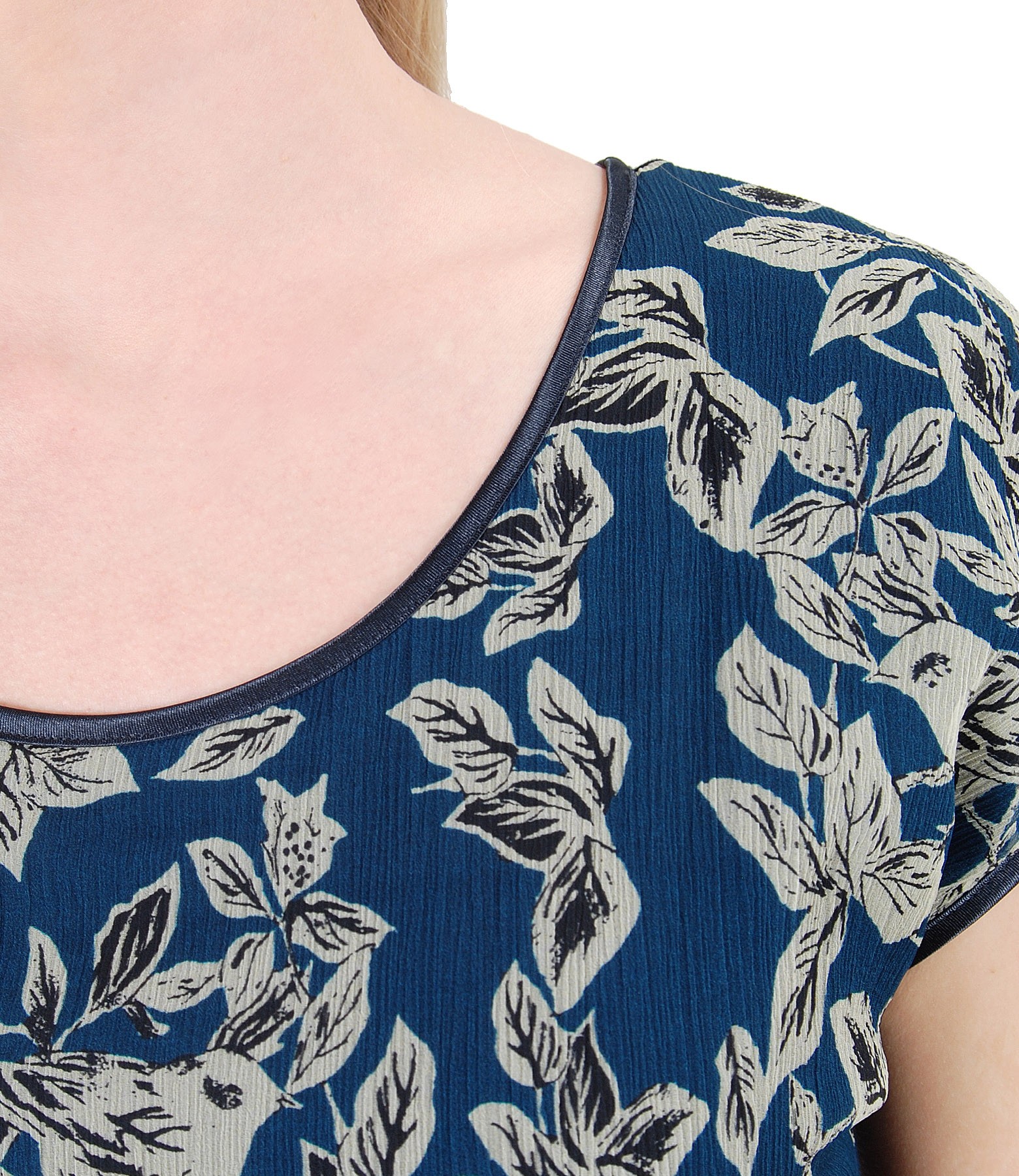 Bluza din jerse elastic, cu fata din matase imprimata digital cu flori, cu decolteu rotund si maneci cazute.