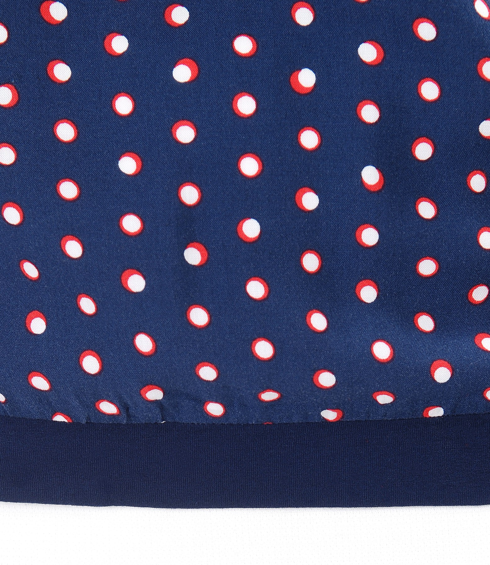 Bluza din jerse elastic, cu fata din viscoza imprimata cu picouri, cu decolteu rotund si maneci cazute.