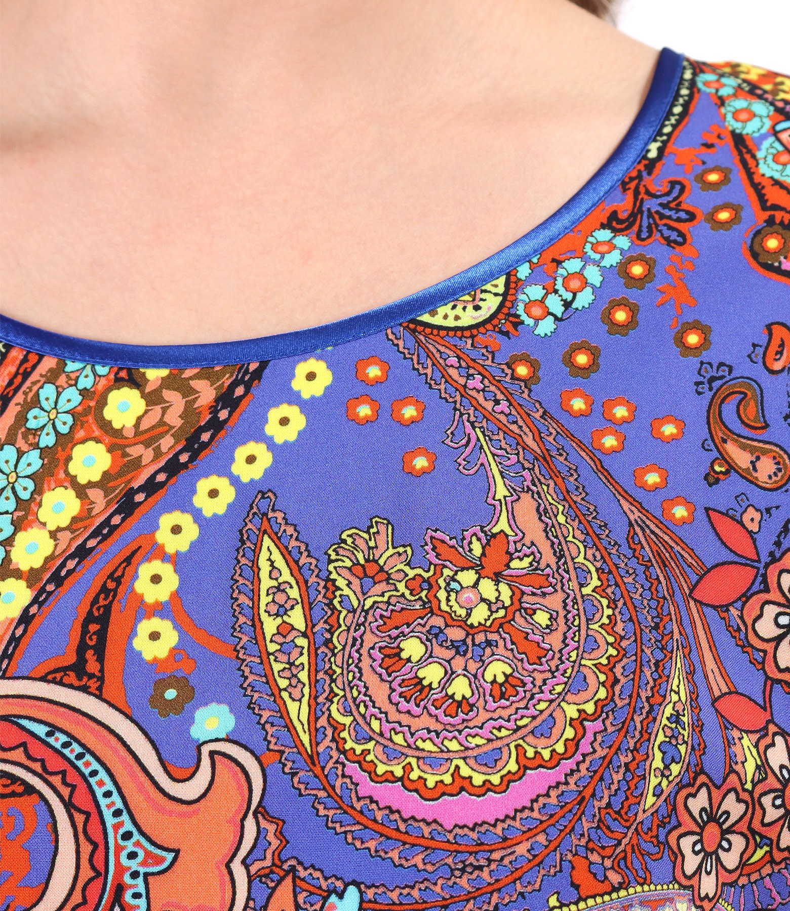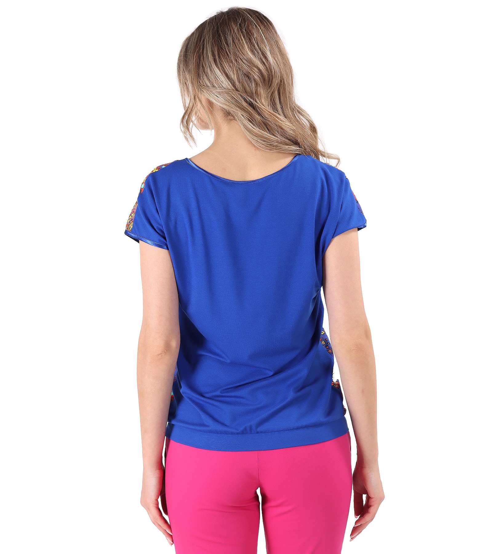 Bluza din jerse elastic, cu fata din viscoza imprimata digital cu lire, cu decolteu rotund si maneci cazute.