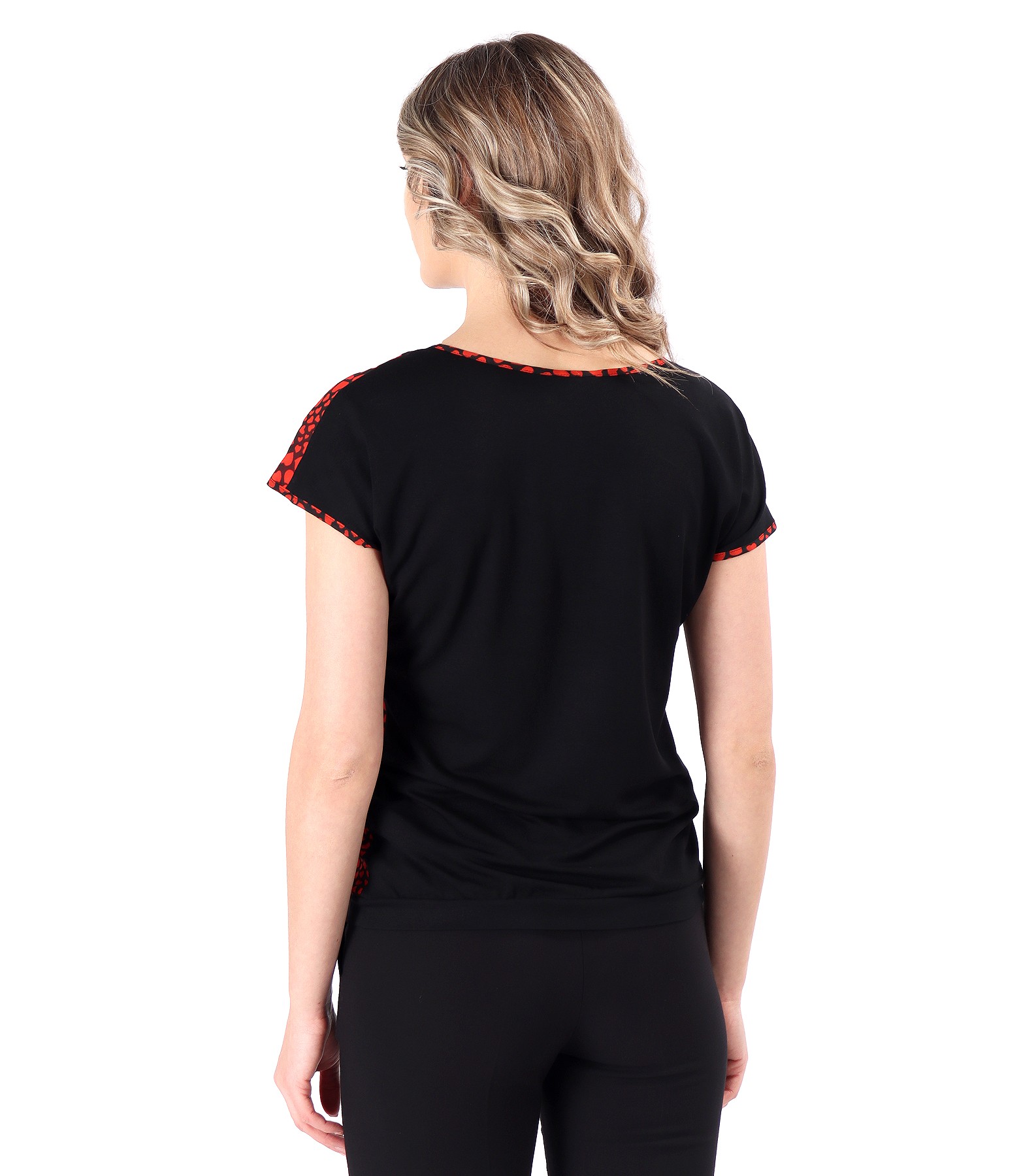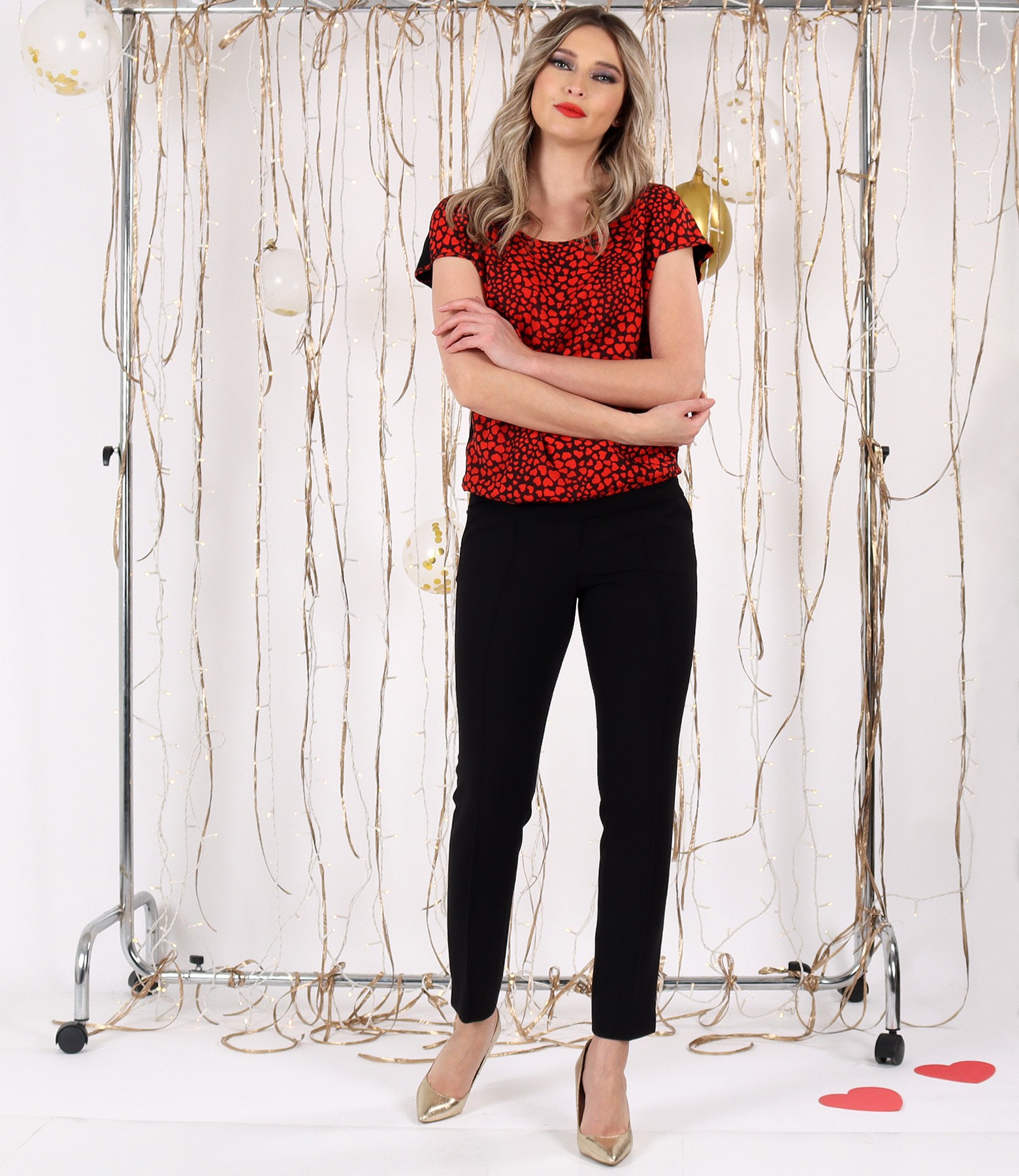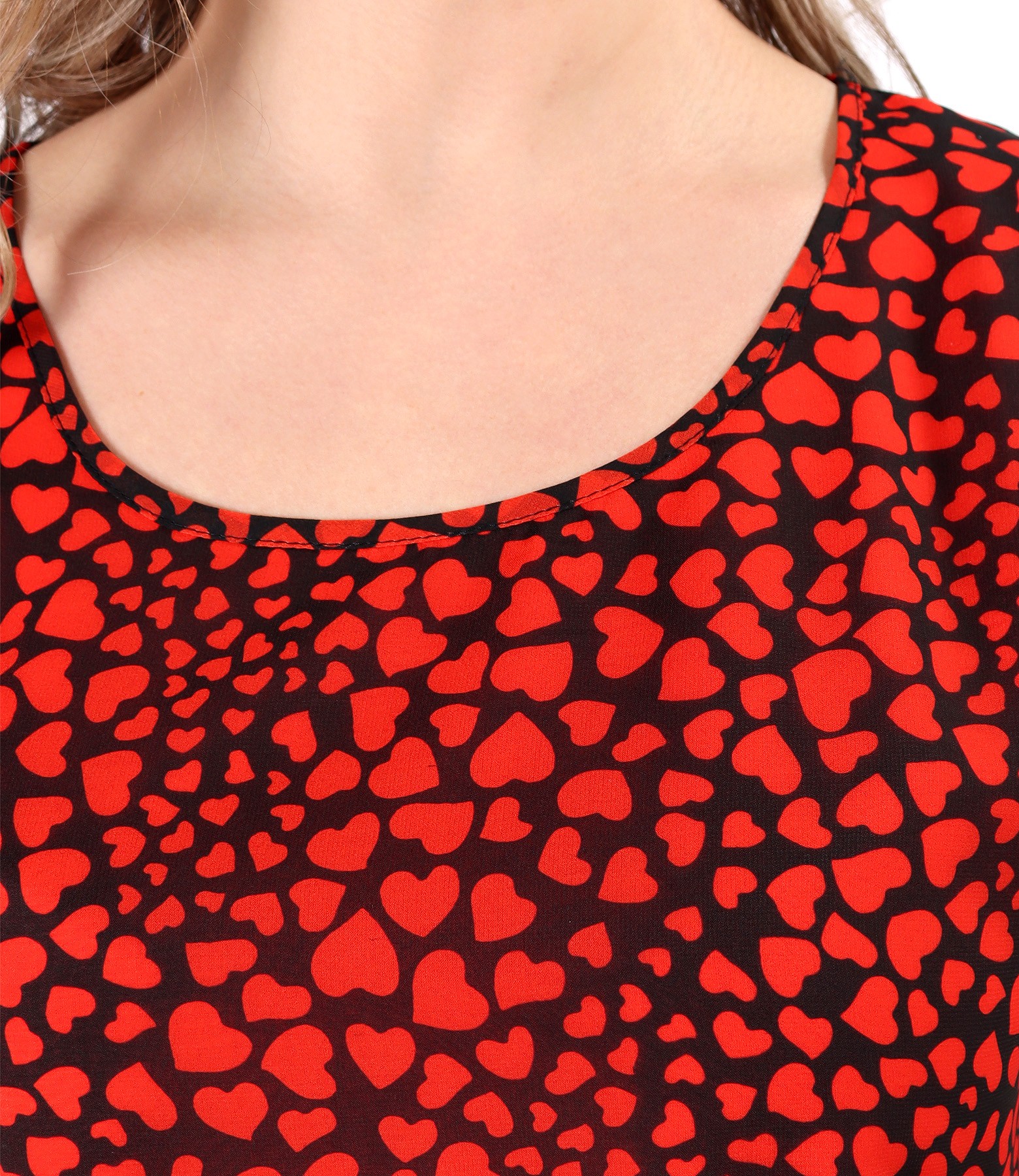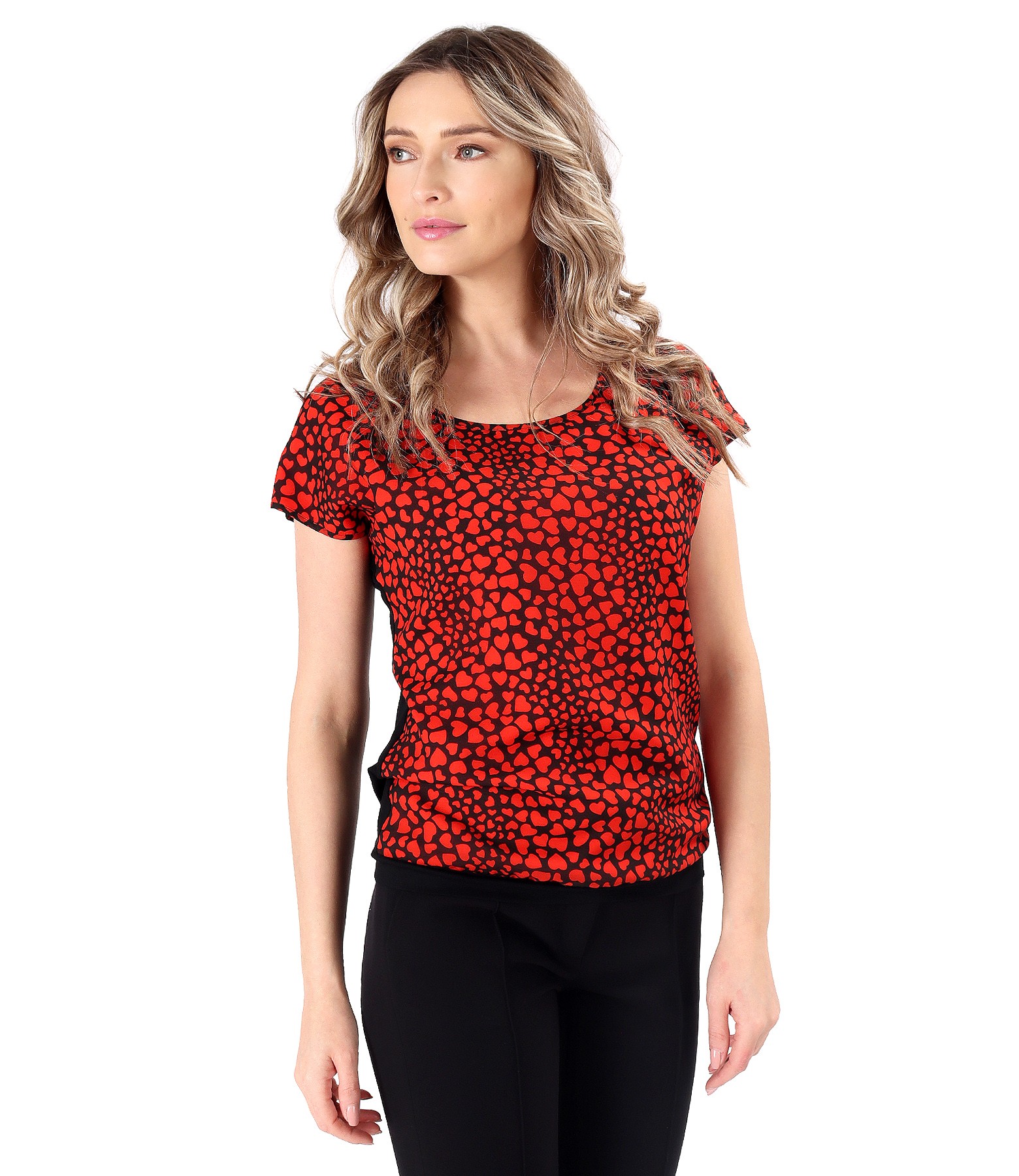Bluza din jerse elastic, cu fata din voal imprimat cu inimi, dublata pe fata cu viscoza, cu decolteu rotund si maneci cazute.