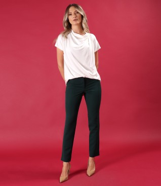 Bluza din jerse elastic, cu fata din voal impimat, dublata pe fata cu viscoza, cu decolteu rotund si maneci cazute.