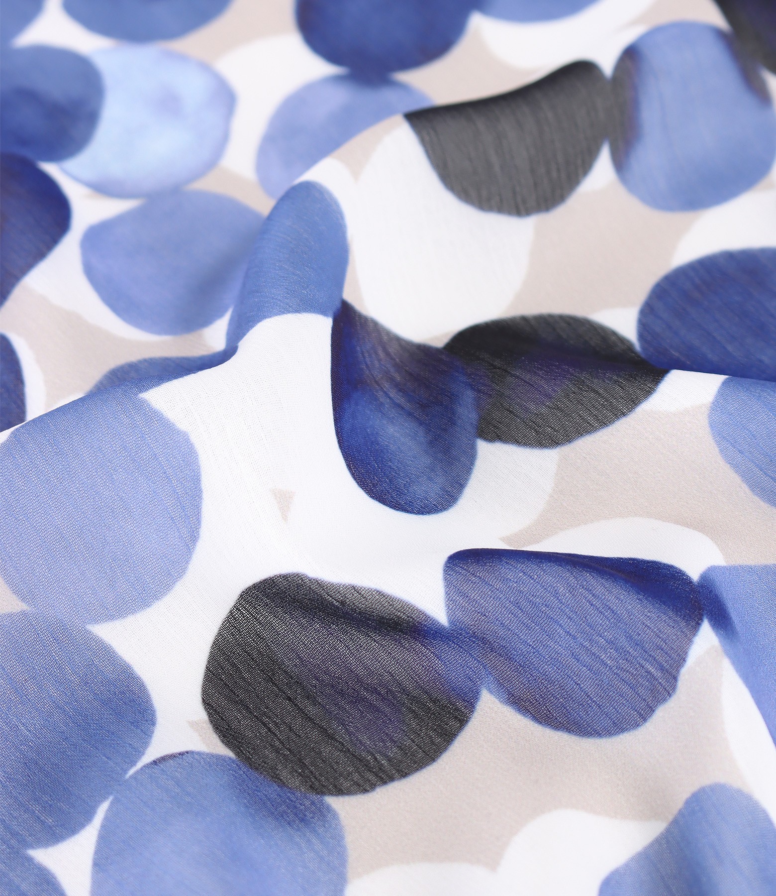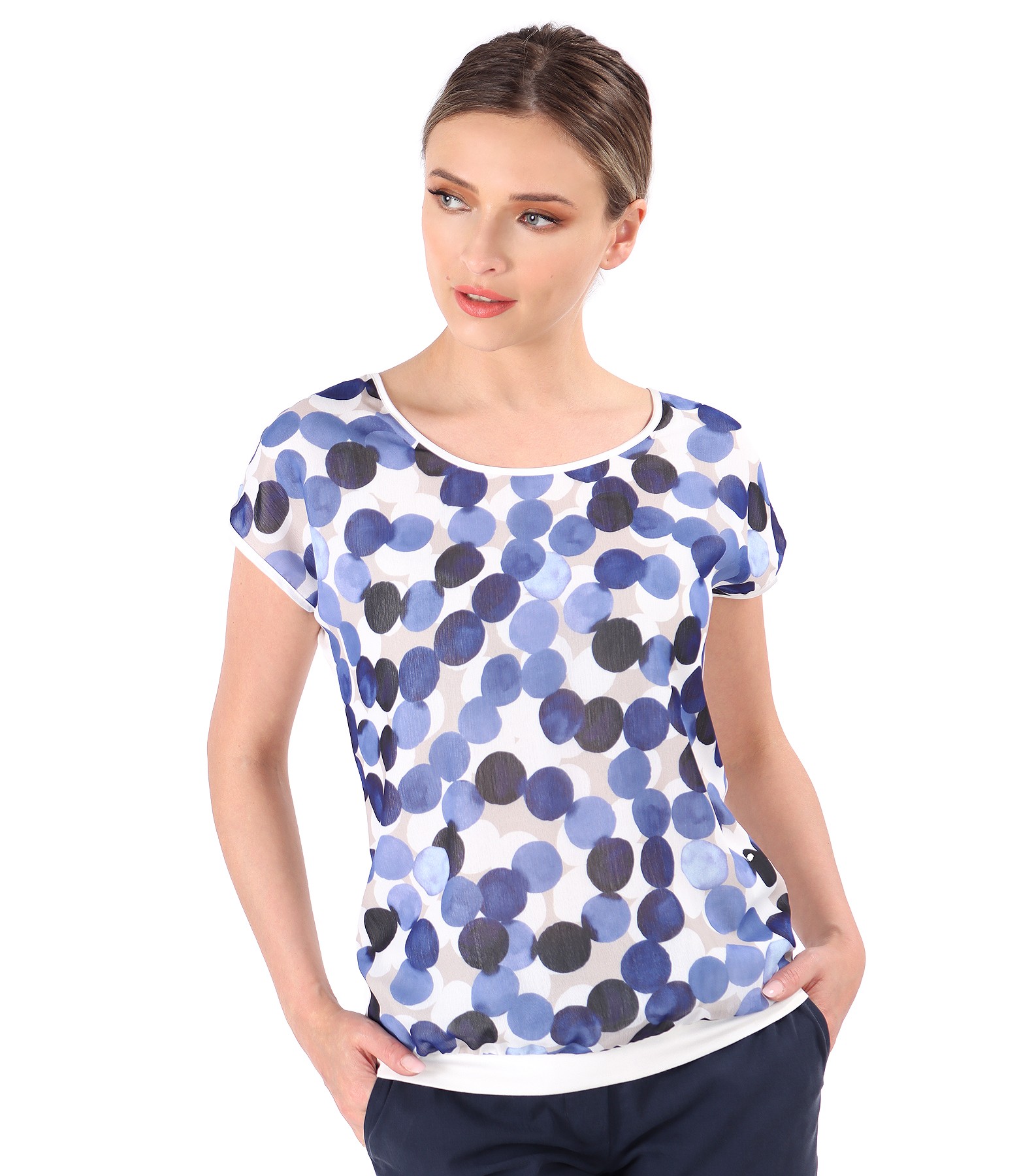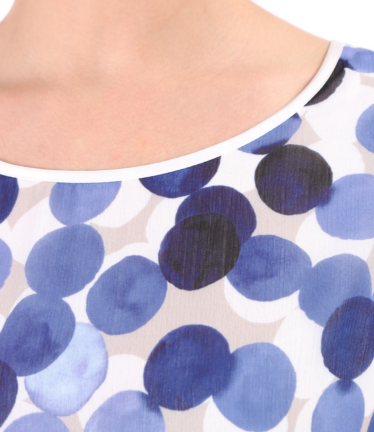 Bluza din jerse elastic, cu fata din voal imprimat digital cu buline, cu decolteu rotund si maneci cazute.