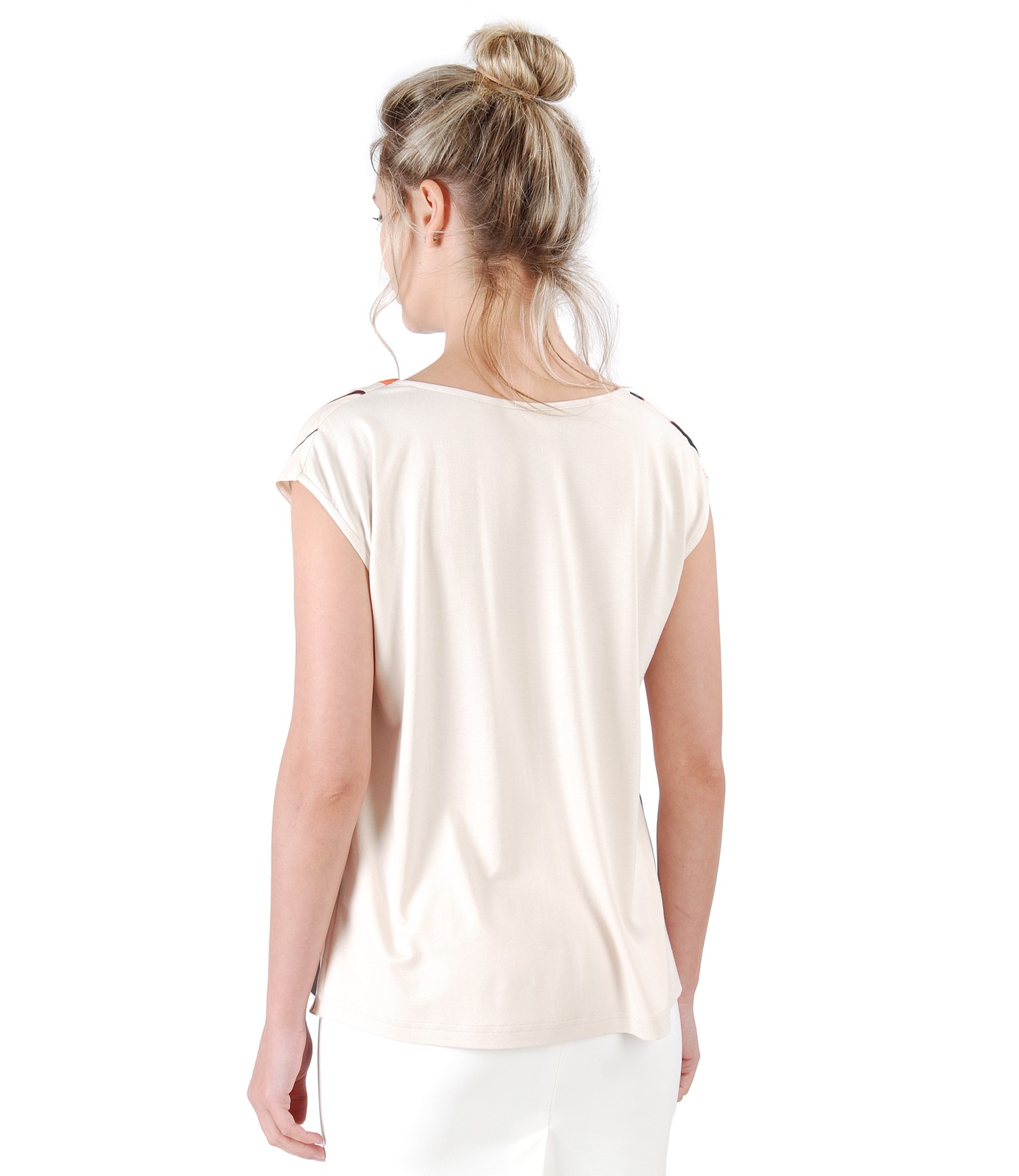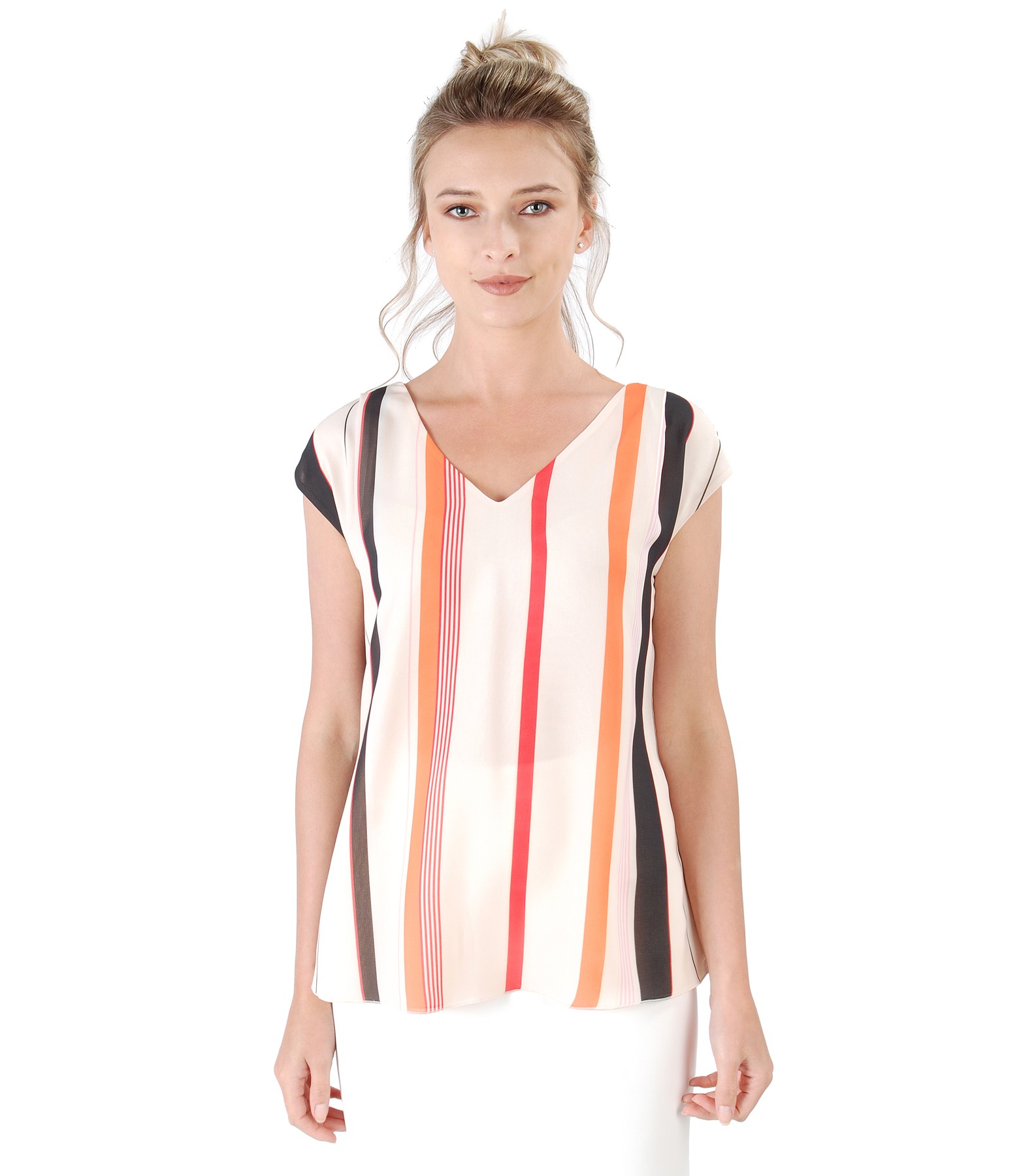 Bluza lejera, cu fata imprimata digital cu dungi, spate din jerse elastic uni, umeri cazuti si decolteu in V.