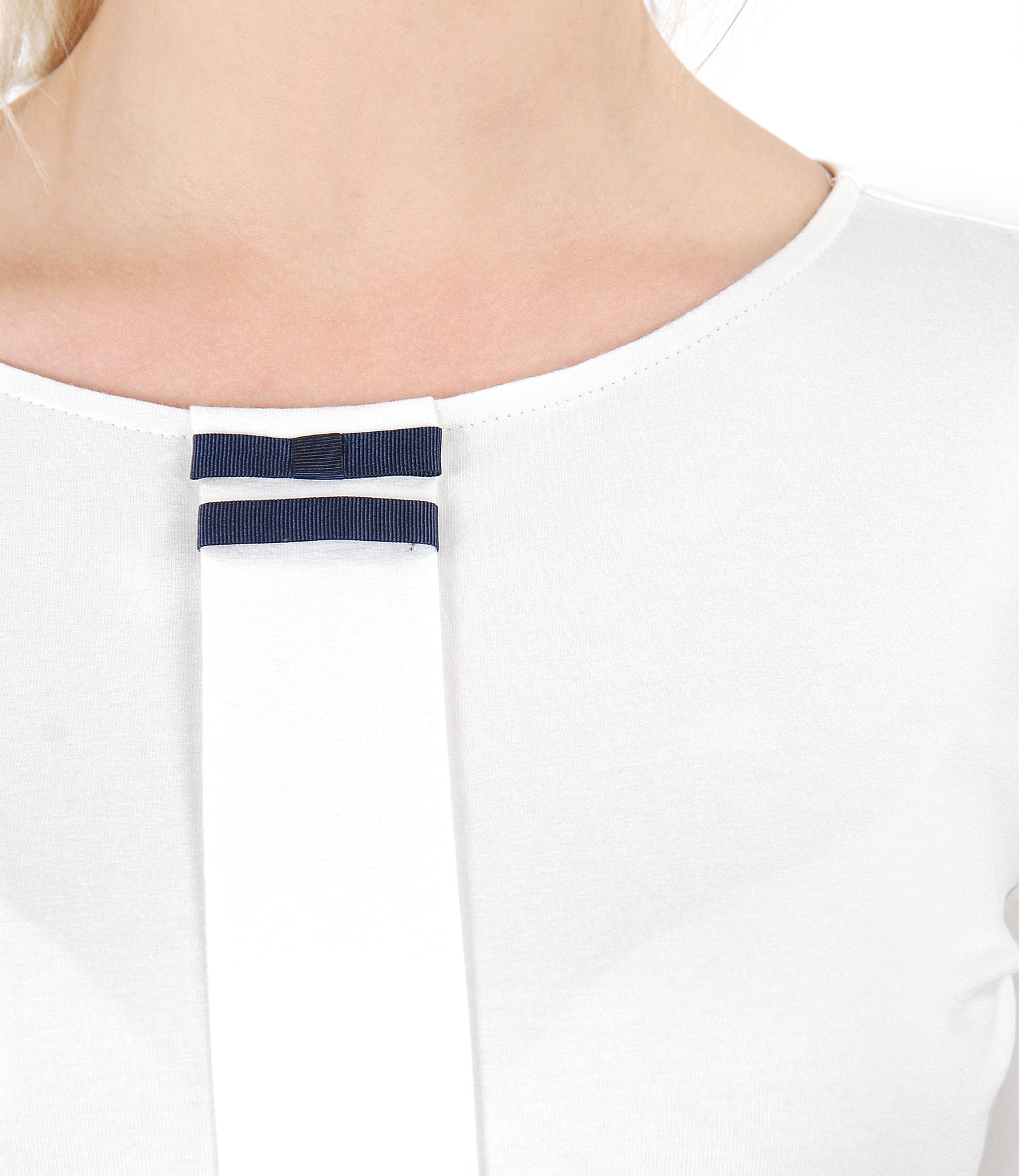 Bluza din jerse elastic uni, cu maneci lungi, decolteu rotund si funda din rips aplicata la decolteu. Nu are sistem de inchidere.