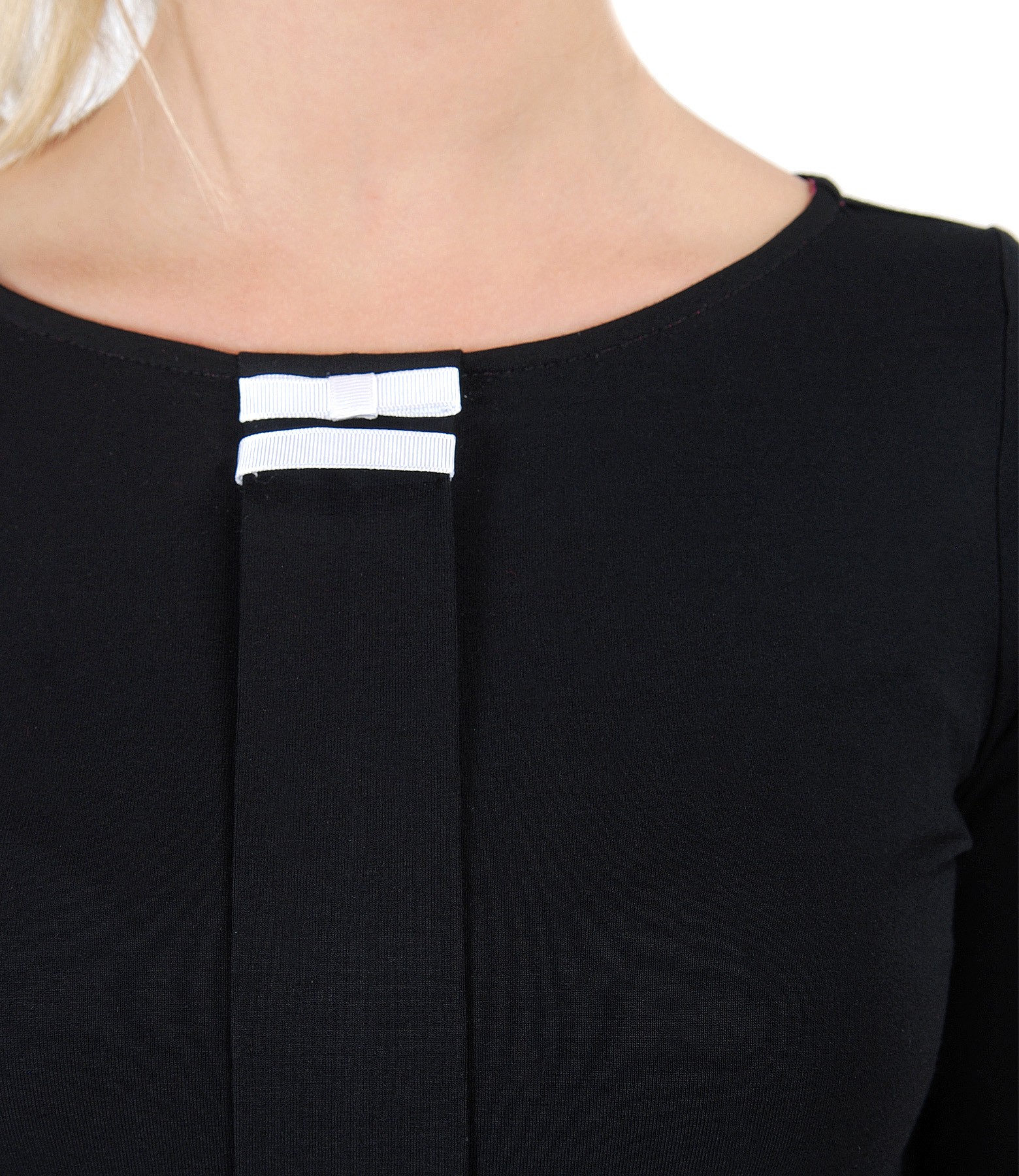 Bluza din jerse elastic uni, cu maneci lungi, decolteu rotund si funda din rips aplicata la decolteu. Nu are sistem de inchidere.