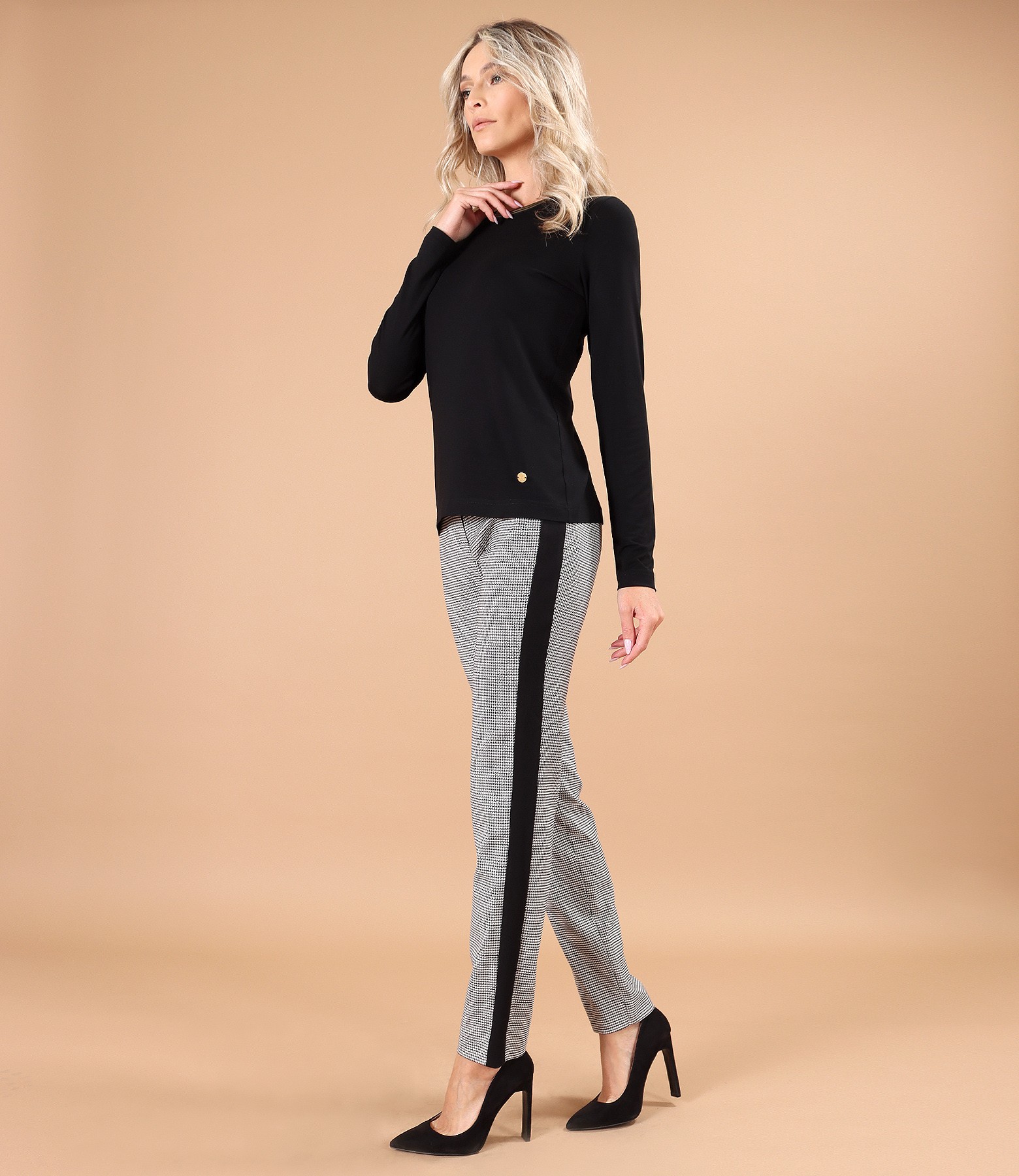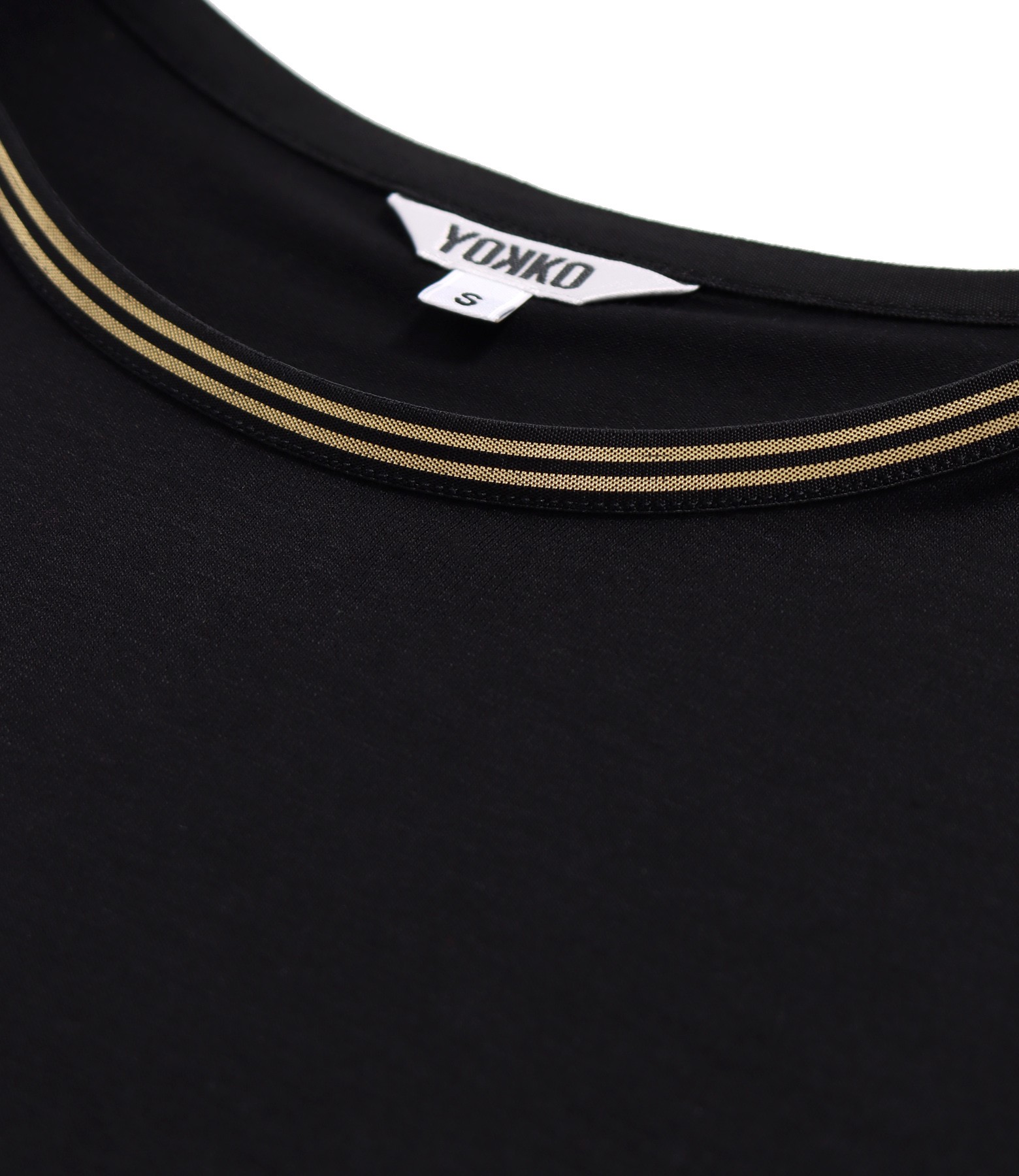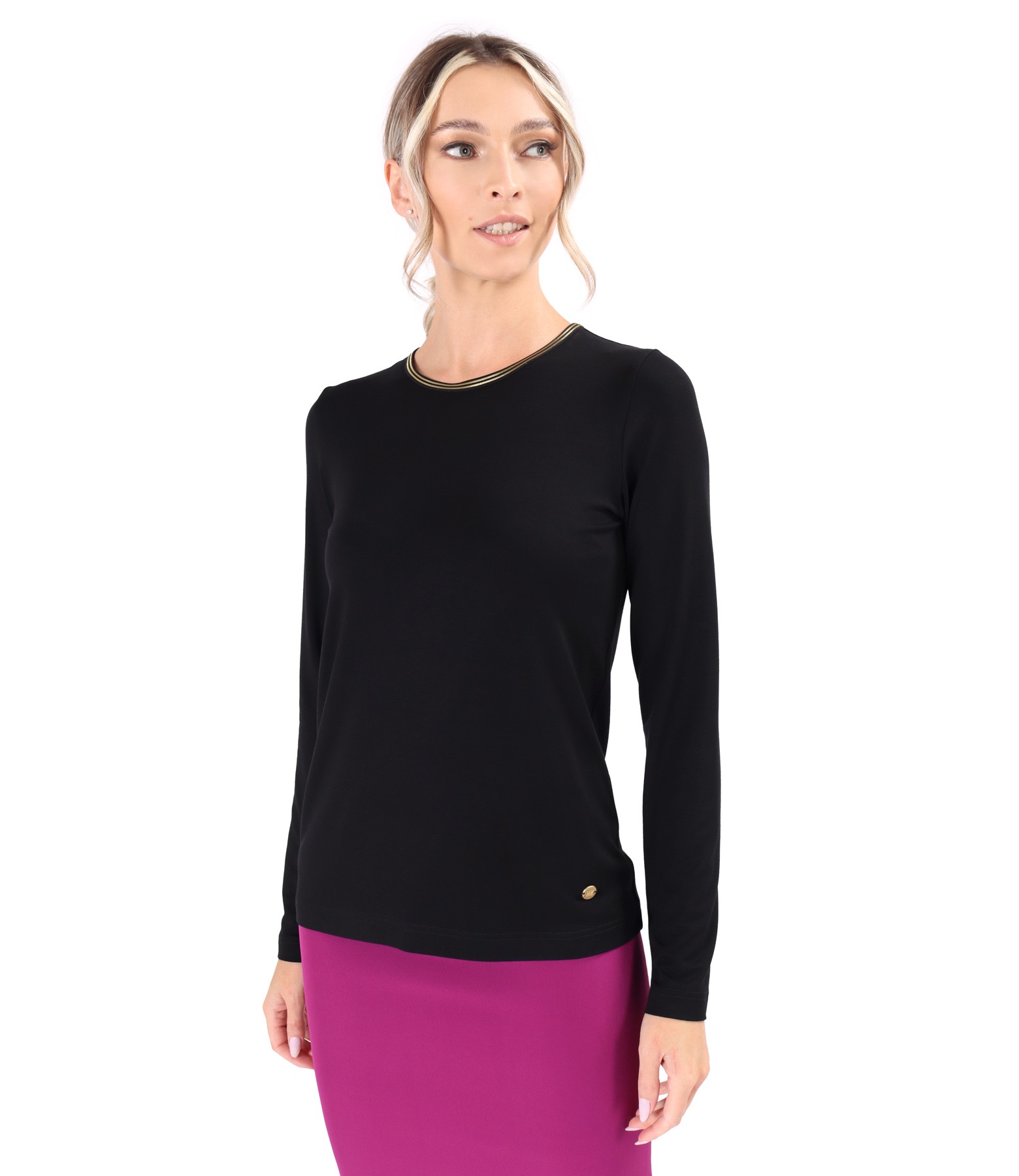 Bluza cu maneci lungi din jerse elastic uni, cu decolteu rotund cu garnitura din elastic auriu.