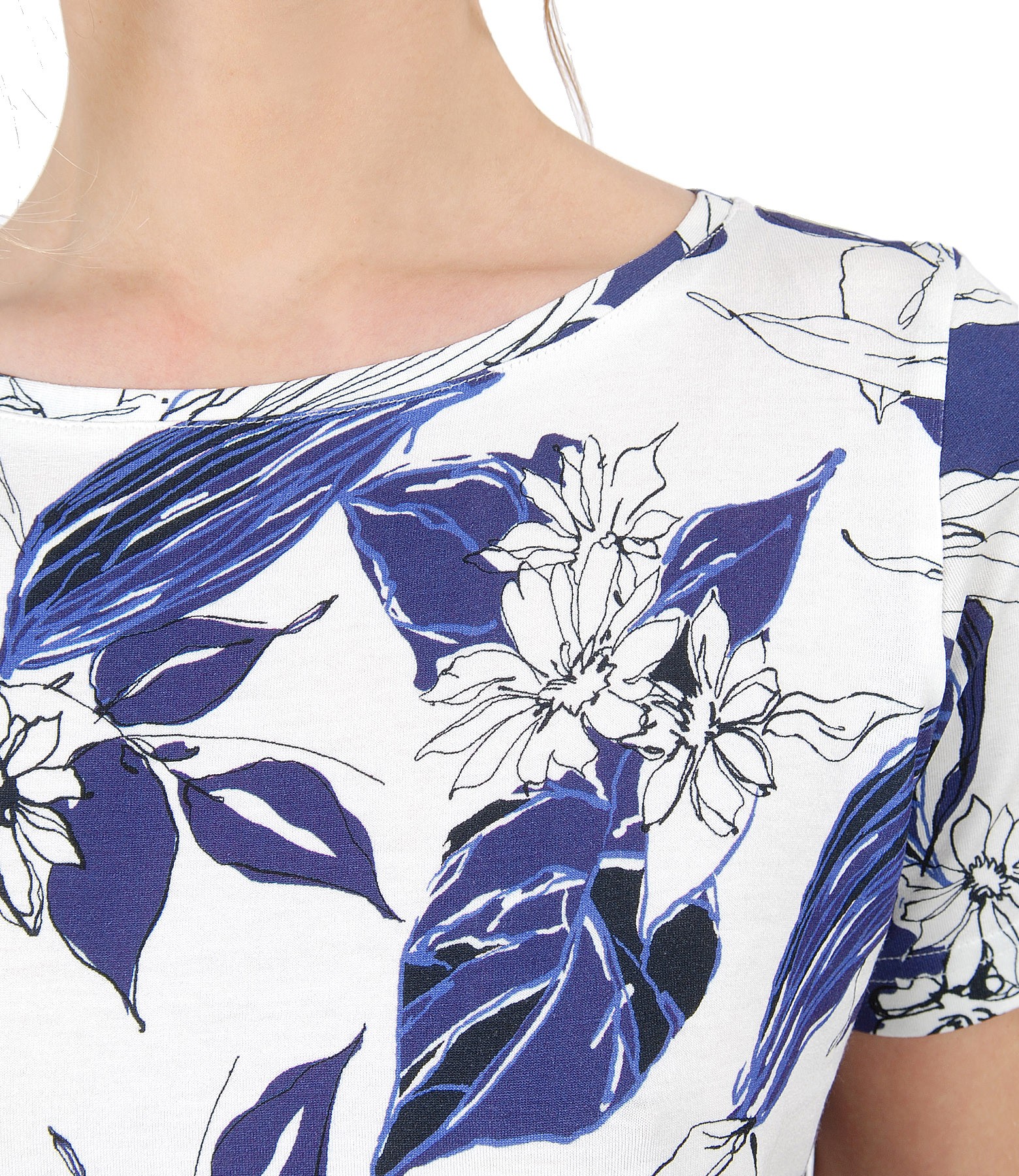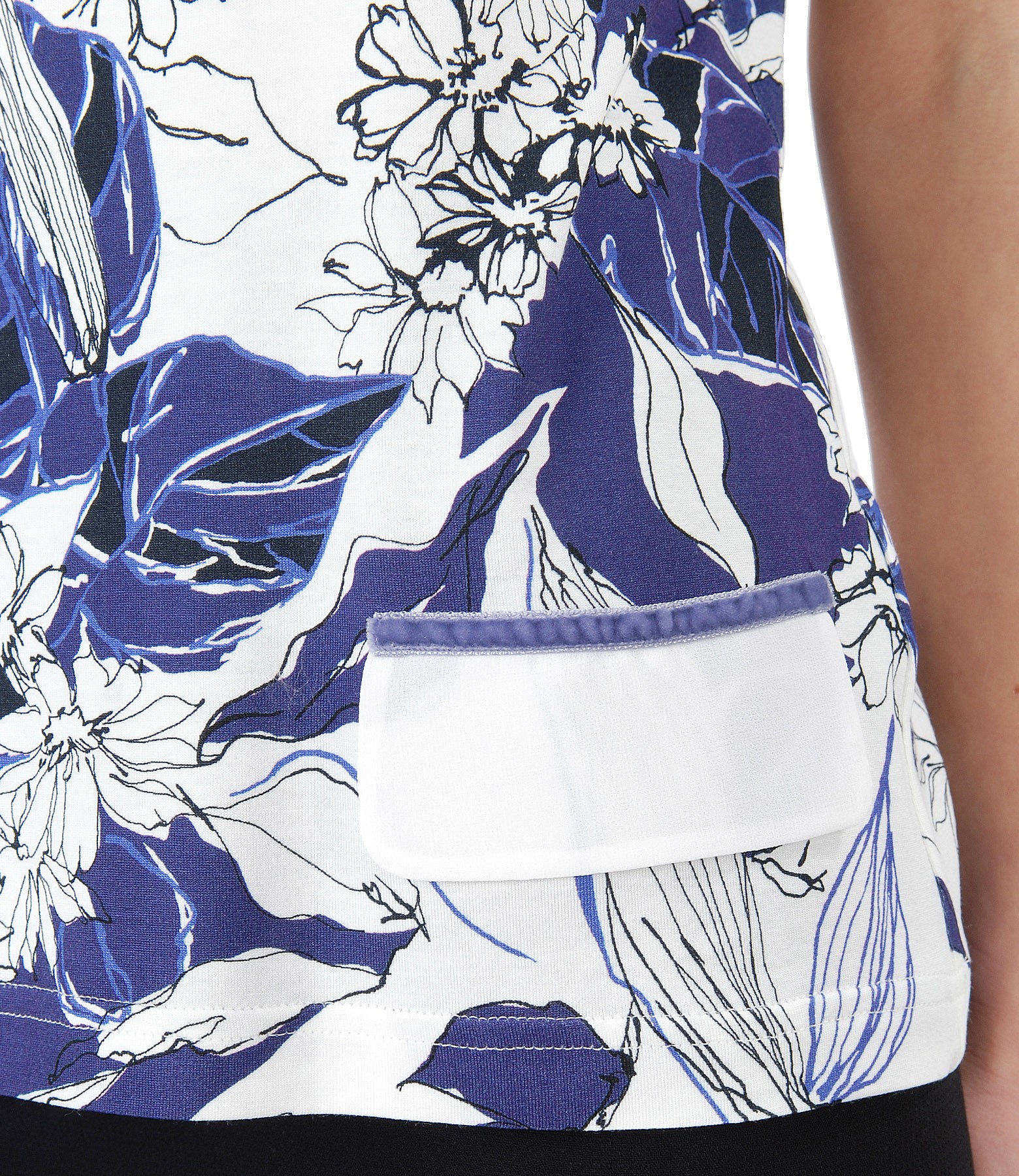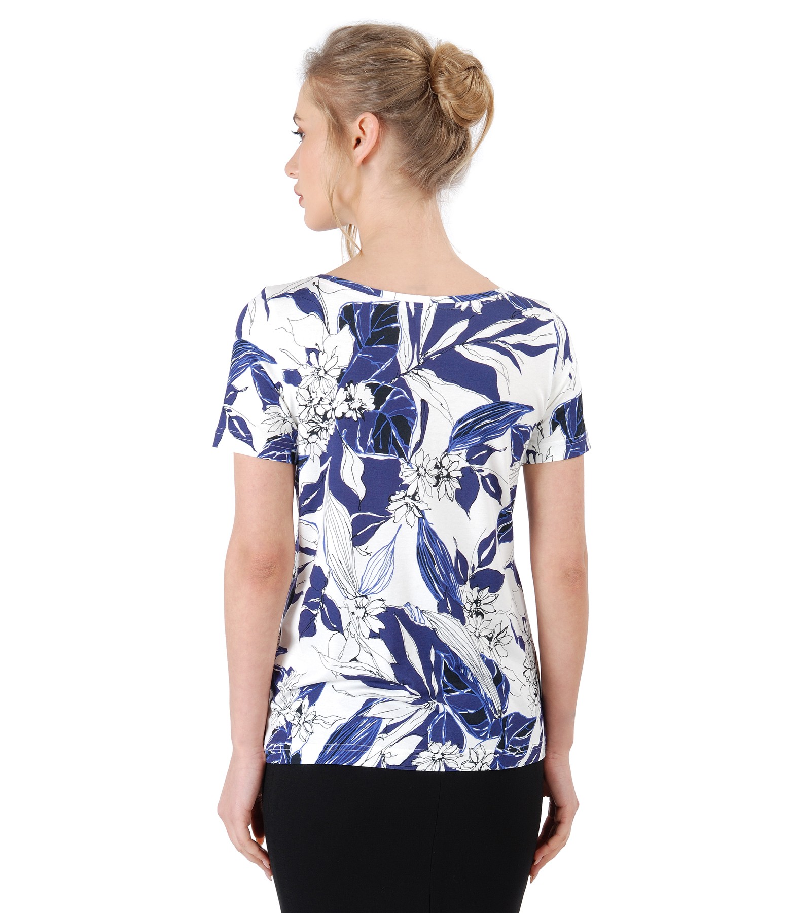 Bluza din jerse elastic imprimat cu motive florale, cu clape decorative din voal si banda din catifea, cu decolteu barcuta si maneci scurte.