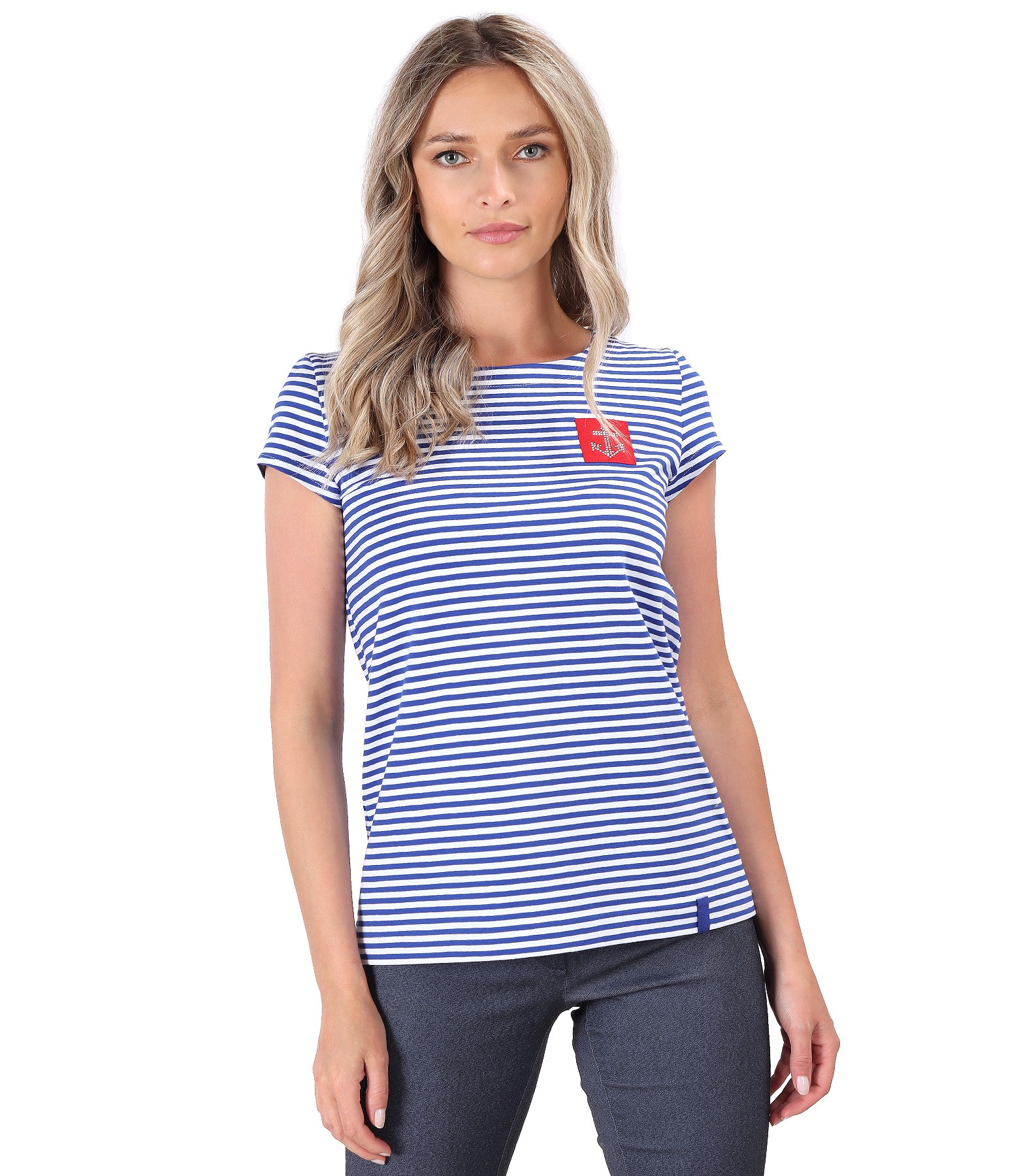 Bluza din jerse elastic de bumbac imprimat cu dungi, cu maneci scurte si cu decolteu rotund cu aplicatie decorativa in forma de ancora.