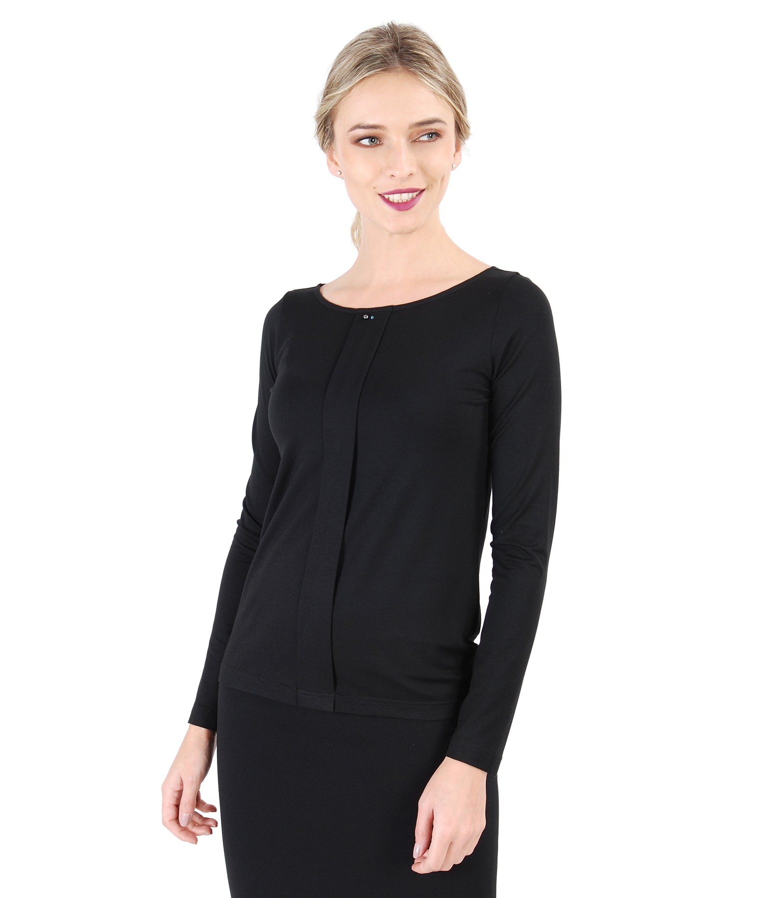 Bluza din jerse elastic uni, cu maneci lungi, decolteu rotund si aplicatie de cristale la decolteu.