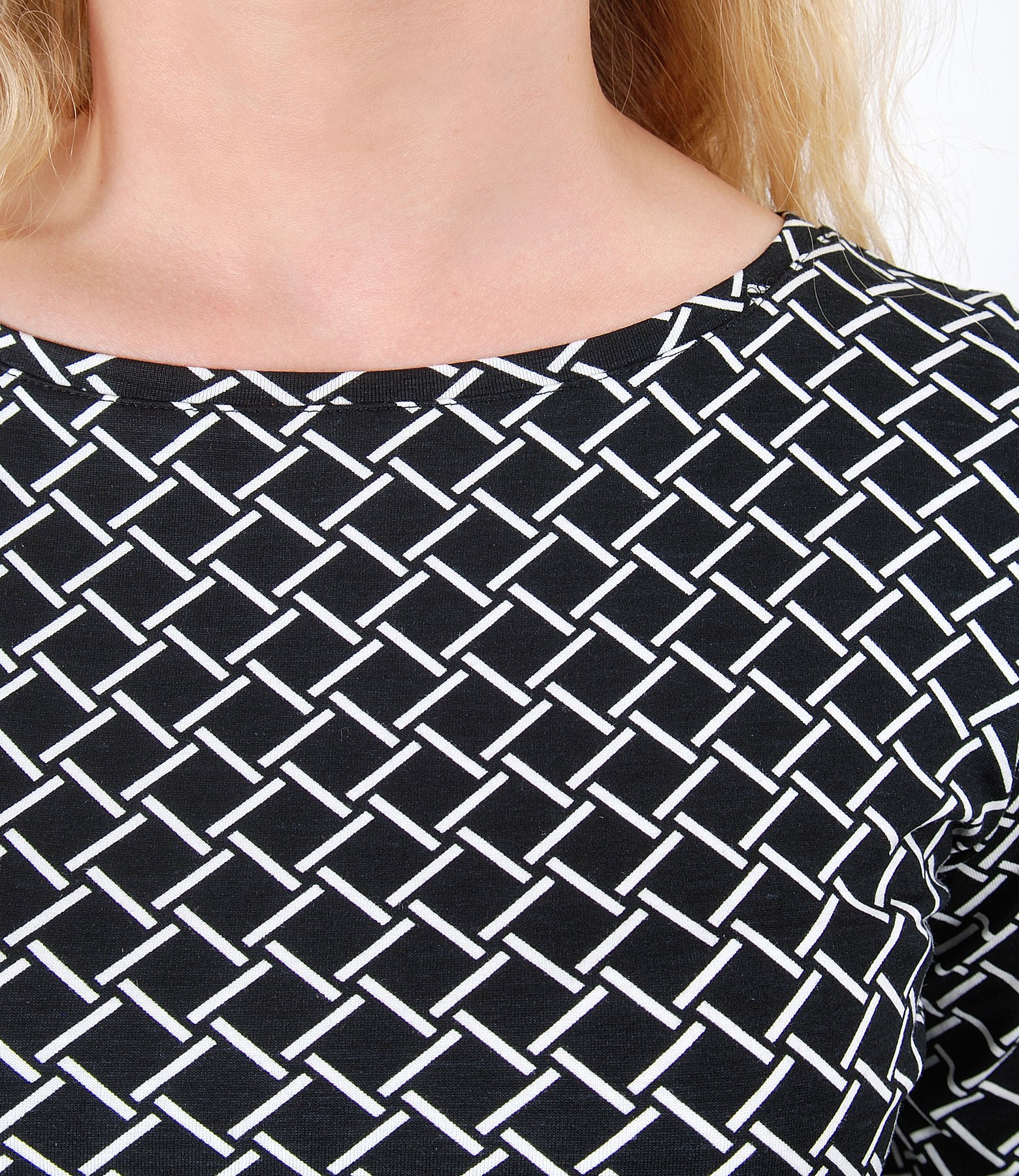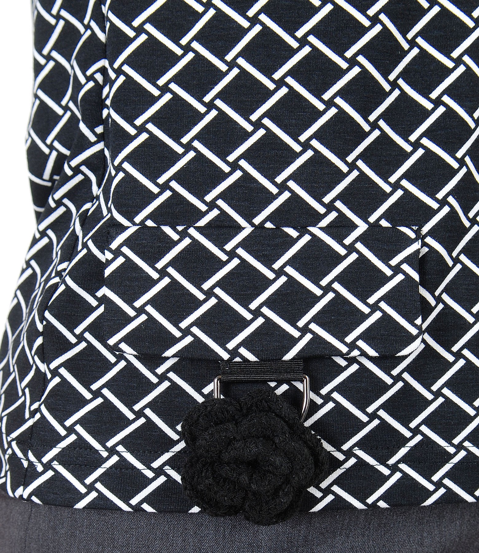 Bluza eleganta din jerse elastic imprimat cu dungi, cu maneci 3/4, clape decorative si floare decorativa aplicata pe clapa dreapta. Nu are sistem de inchidere.