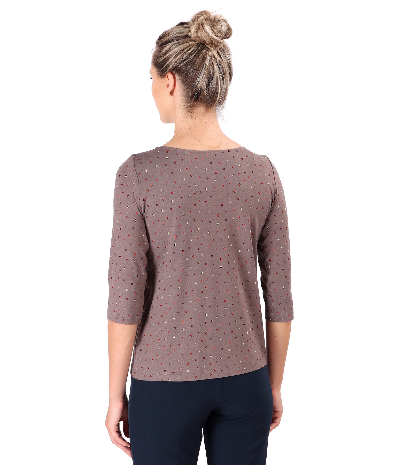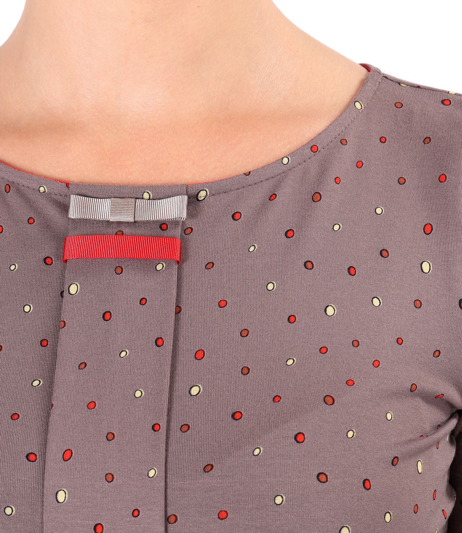Bluza din jerse elastic imprimat cu picouri, cu maneci 3/4, decolteu rotund si funda din rips la decolteu.