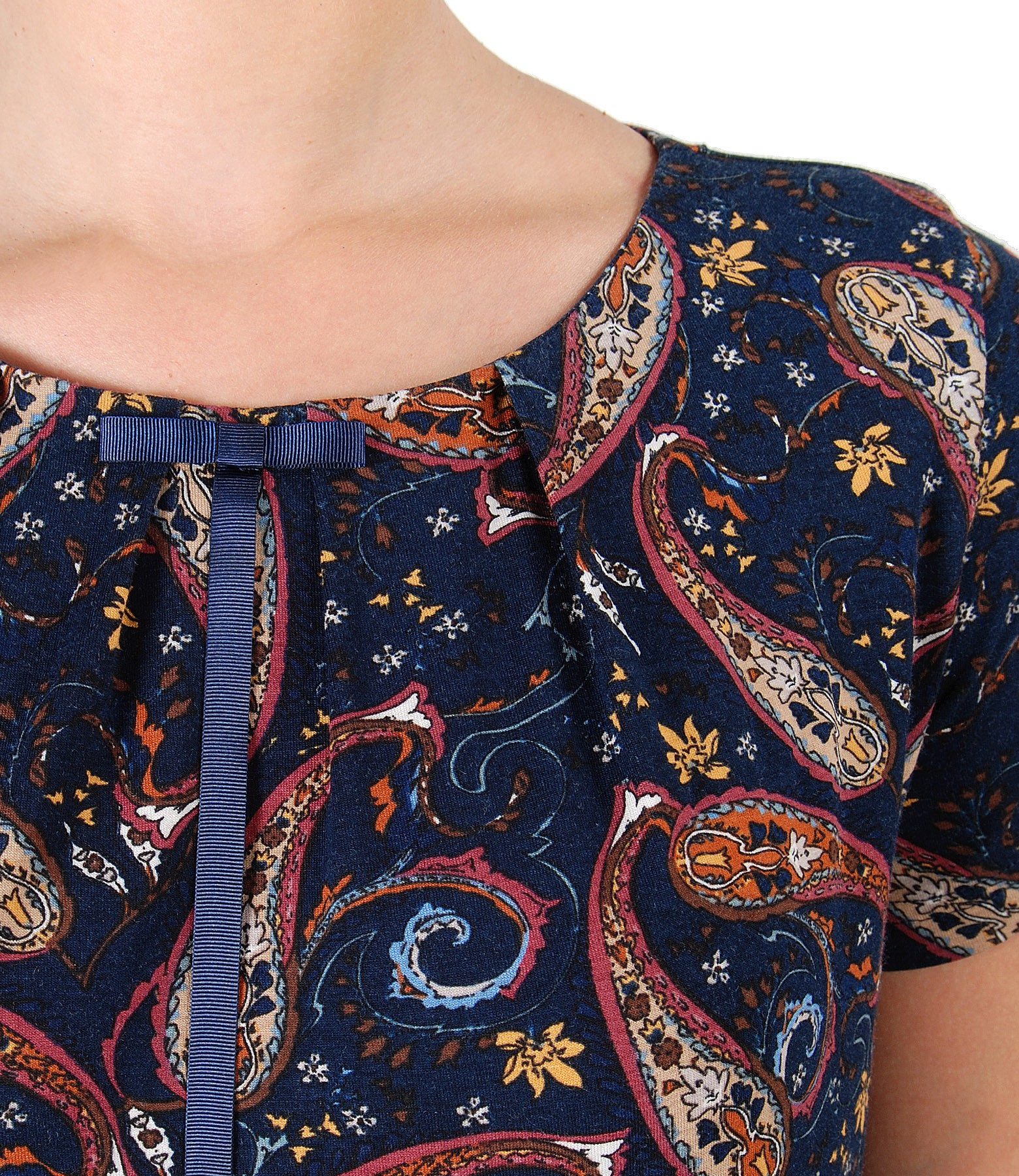 Bluza din jerse elastic cu maneci 3/4 imprimat cu motive florale, falduri pe fata si funda din rips pe decolteu. Se inchide cu un nasture pe mijloc spate.