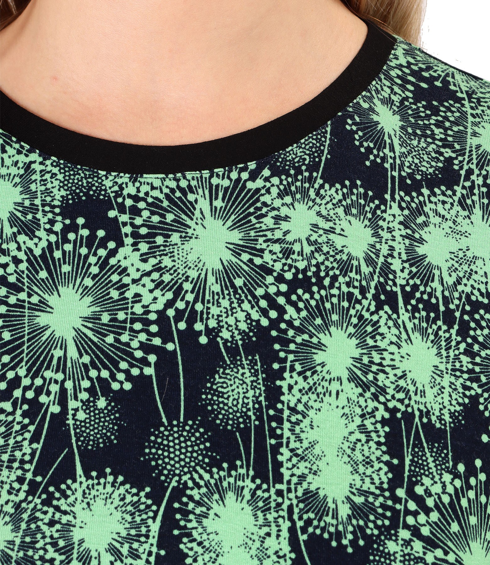 Bluza din jerse elastic imprimat, cu maneci 3/4 si cu garnitura contrast la decolteu si terminatie bluza.