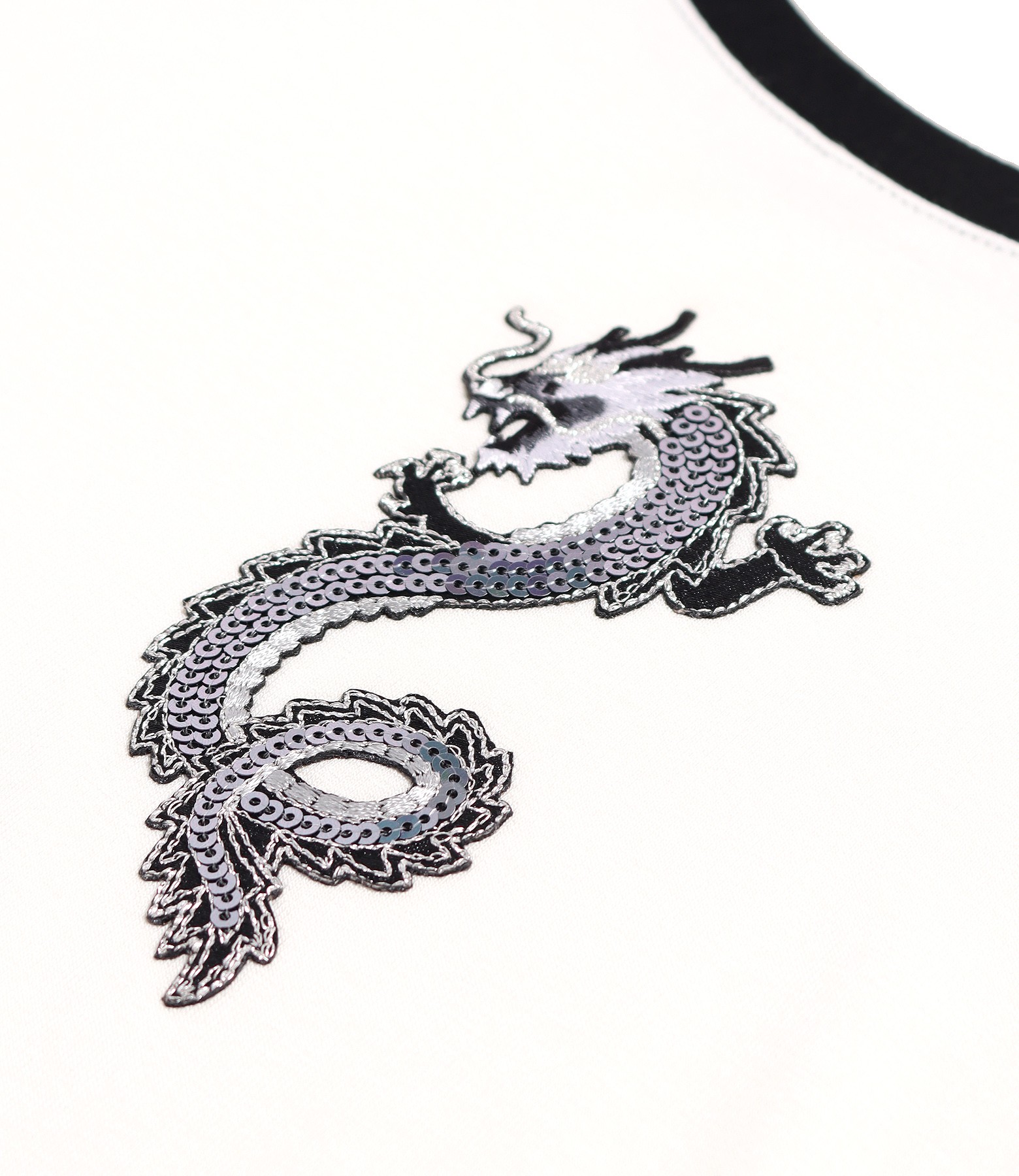 Bluza din jerse elastic cu garnituri in contrast, maneci scurte, decolteu rotund si aplicatie decorativa in forma de dragon aplicata pe fata.