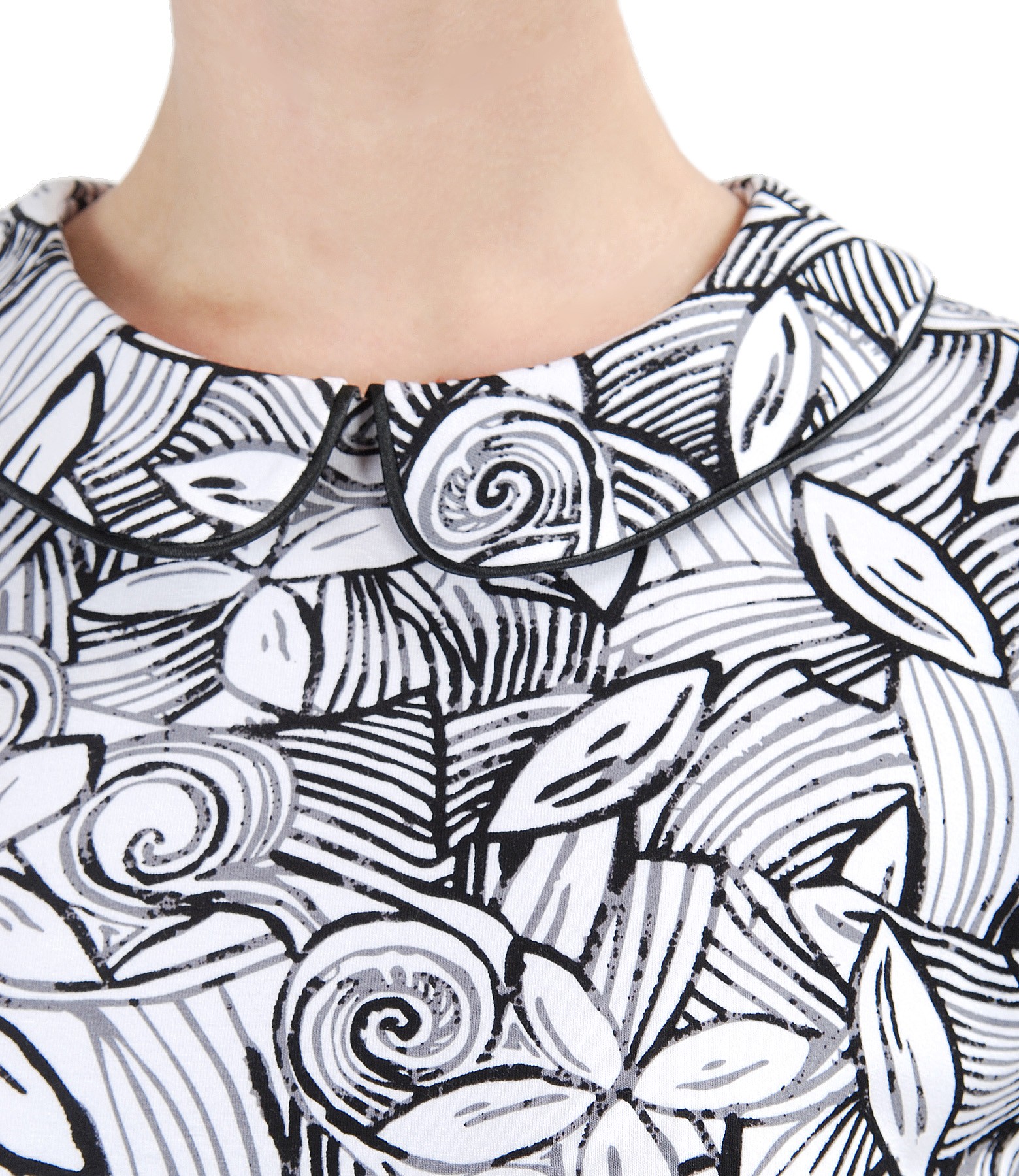 Bluza din jerse elastic imprimat cu motive florale, cu maneci scurte si cu guler rotunjit. Se inchide cu un nasture pe spate.