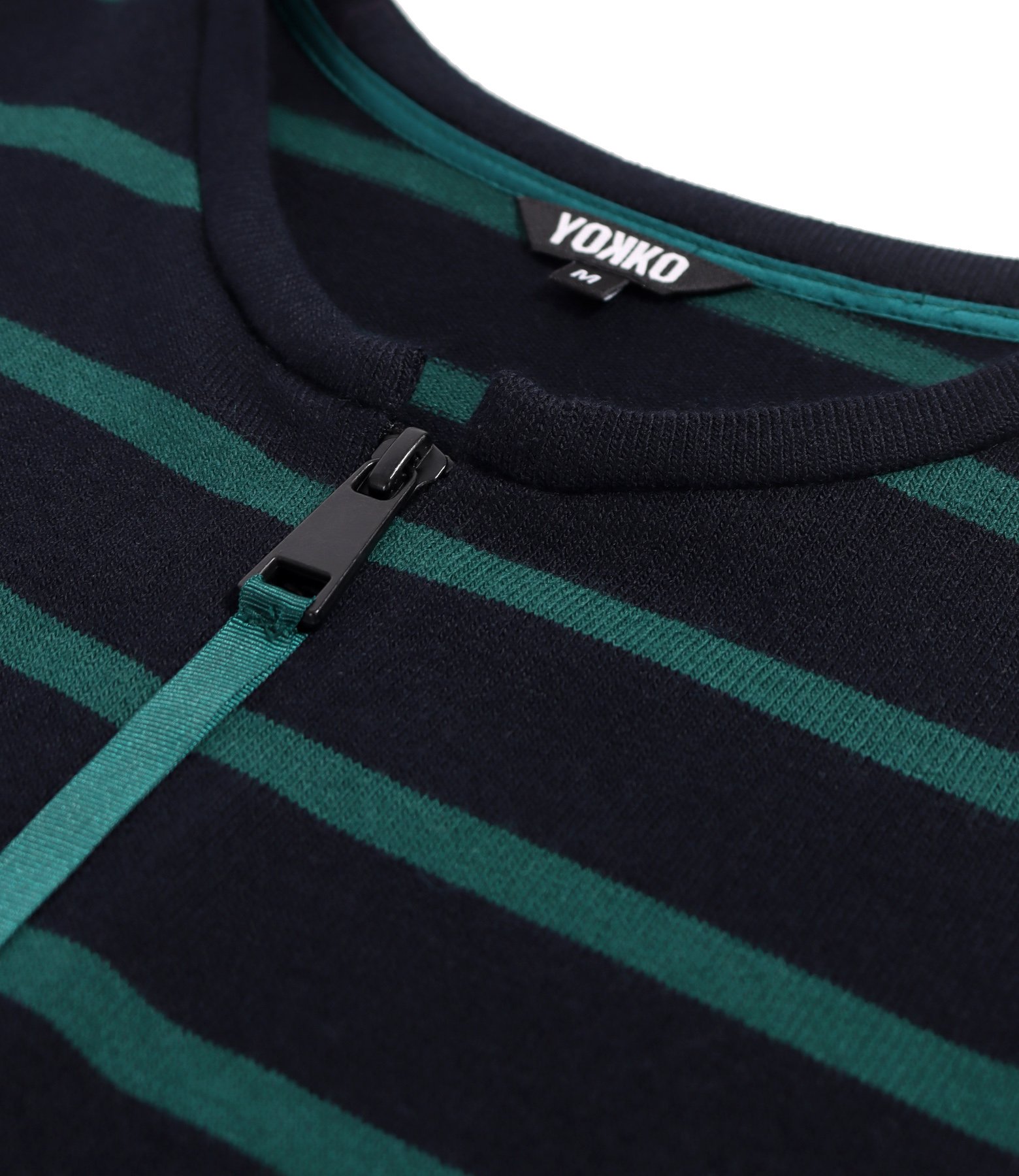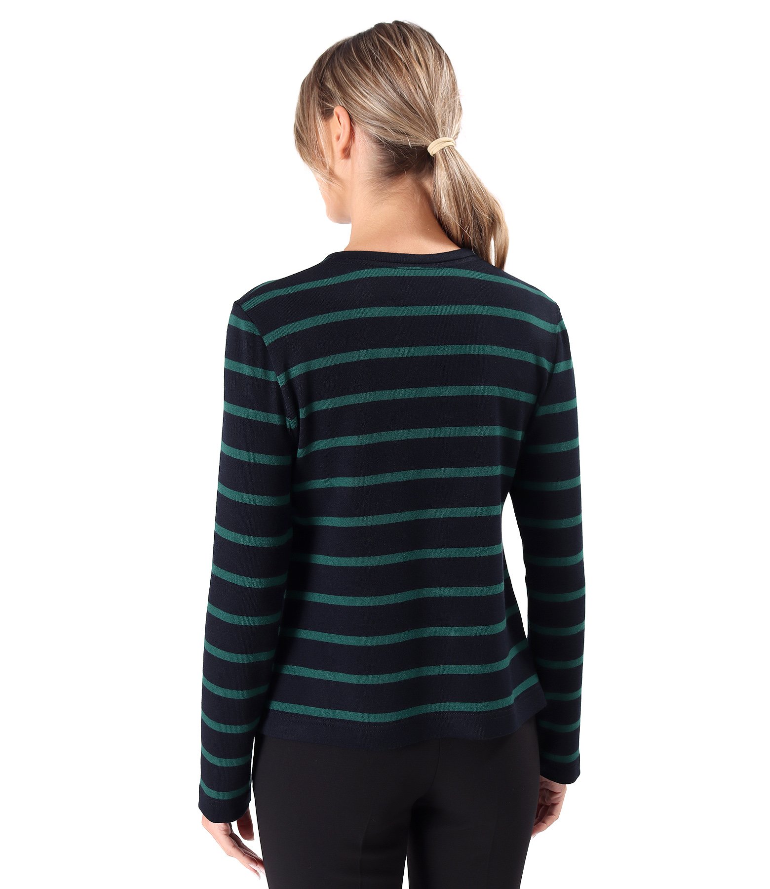Bluza din jerse elastic cu lana cu dungi, cu fermoar pe fata, guler rotund, si cu maneci lungi.
