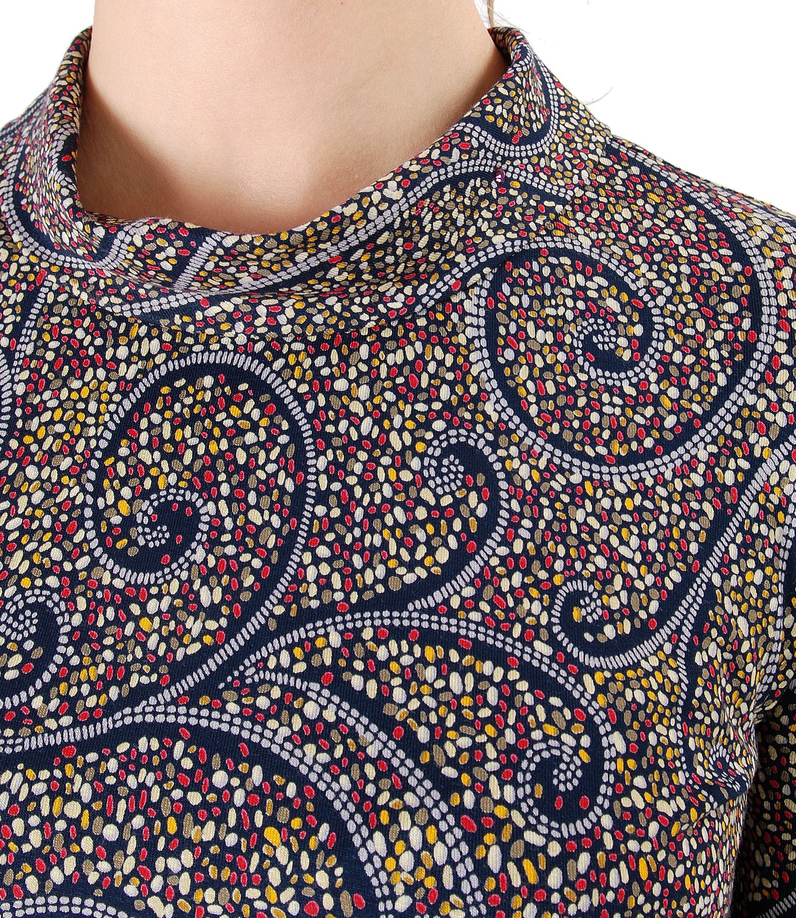 Bluza din jerse elastic imprimat, cu maneci 3/4, guler rotund la baza gatului si aplicatie de cristale pe guler. Se inchide cu un nasture pe mijloc spate.