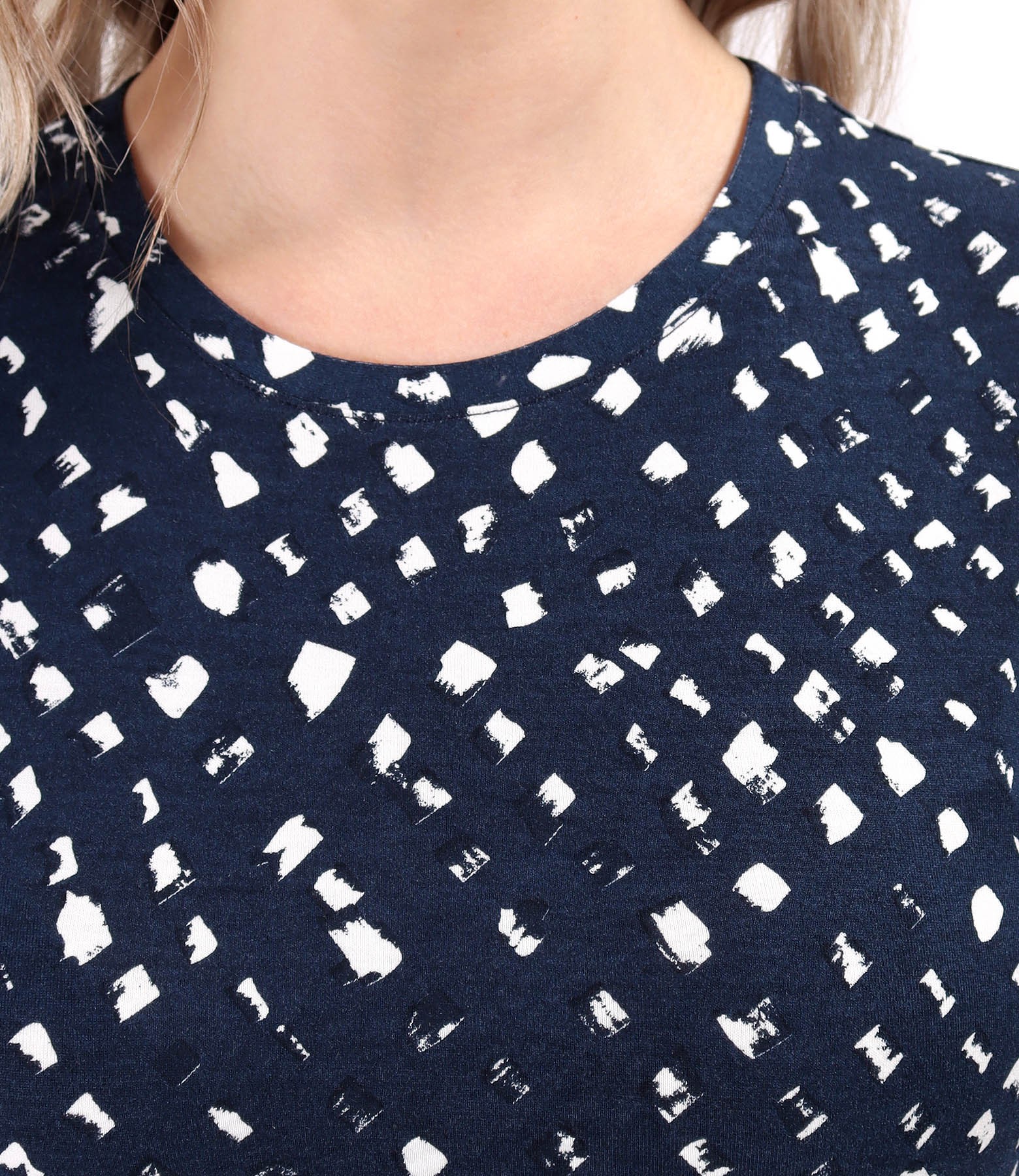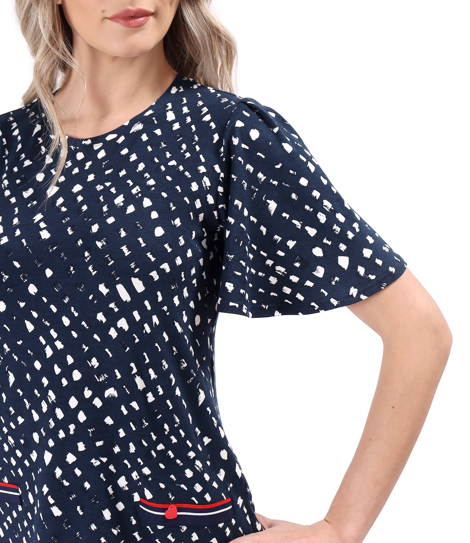 Bluza din jerse elastic de viscoza imprimata cu motive geometrice, cu decolteu rotund, maneci scurte ample si cu banda decorativa cu inima metalica in talie.