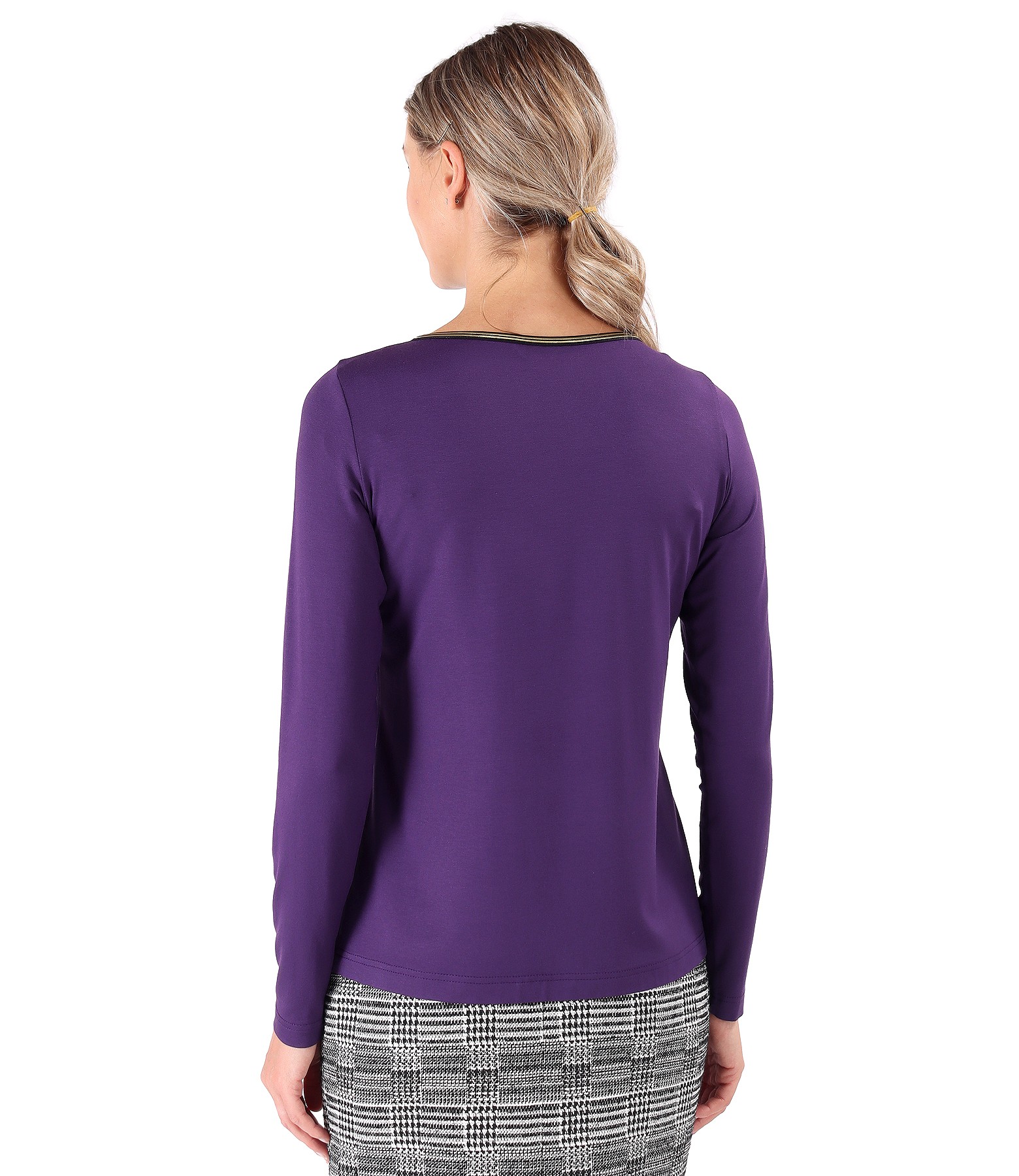 Bluza eleganta din jerse elastic de viscoza, cu maneci lungi si decolteu rotund cu garnitura din elastic auriu.