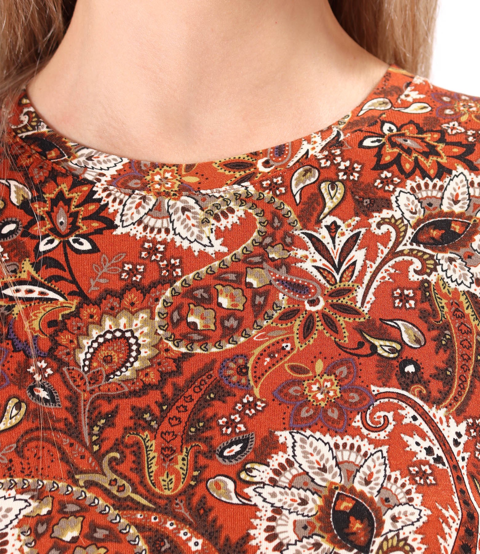 Bluza din jerse elastic de viscoza imprimata cu motive florale, cu maneci lungi si decolteu rotund. Pozitia imprimeului variaza per produs.