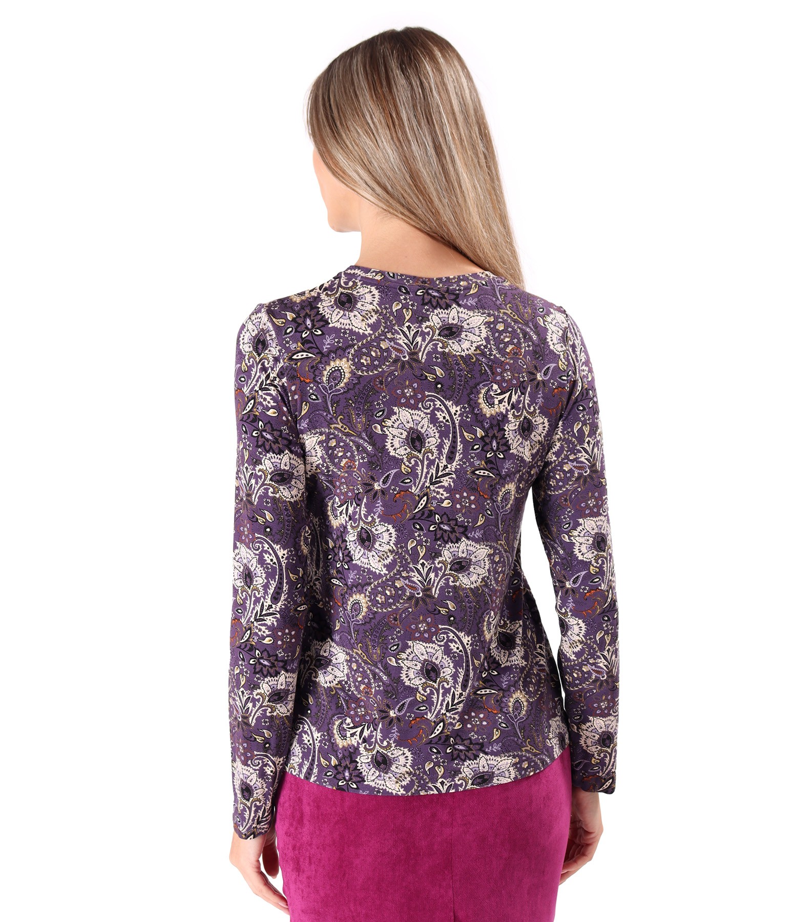 Bluza din jerse elastic de viscoza imprimata cu motive florale, cu maneci lungi si decolteu rotund. Pozitia imprimeului variaza per produs.