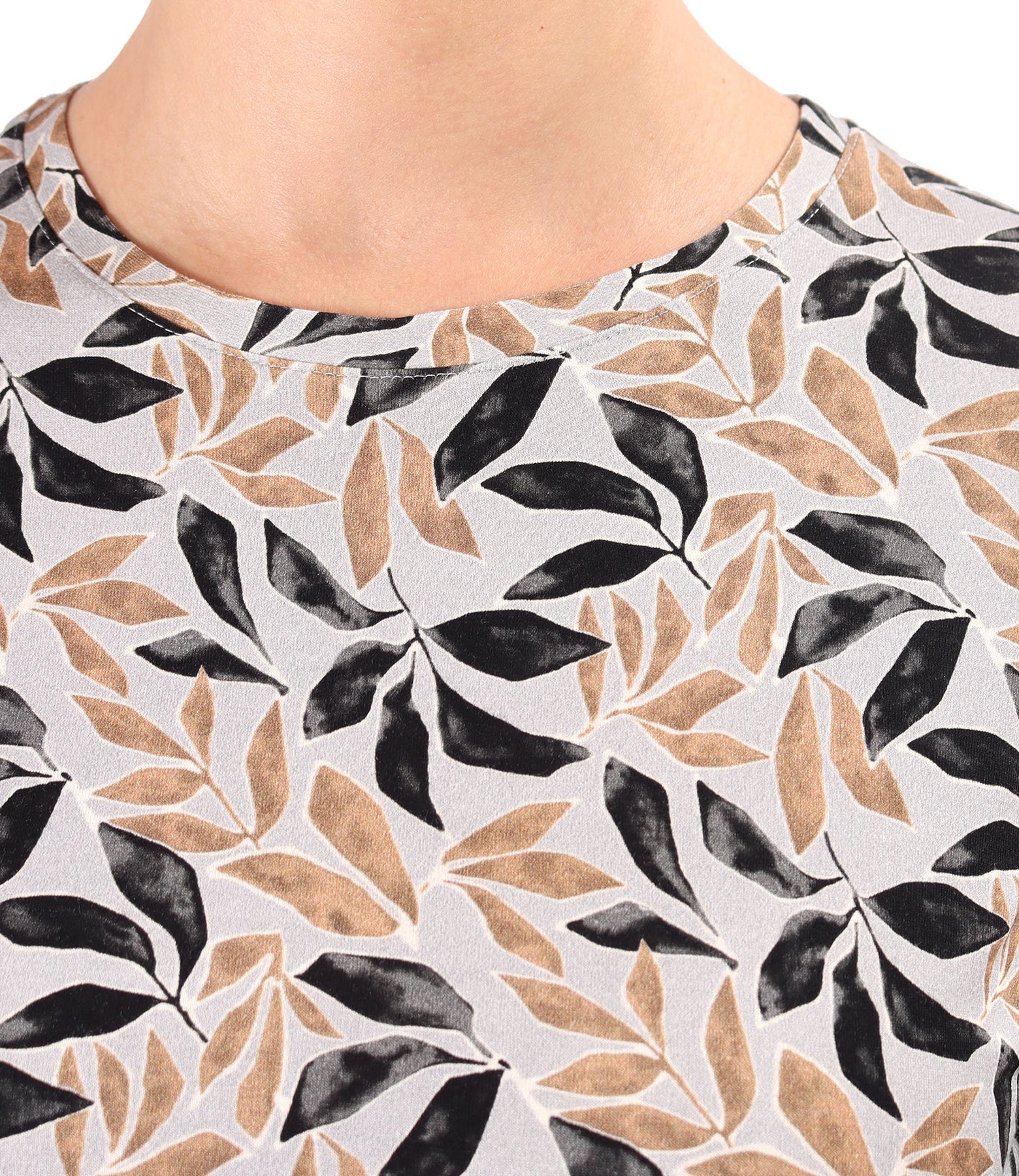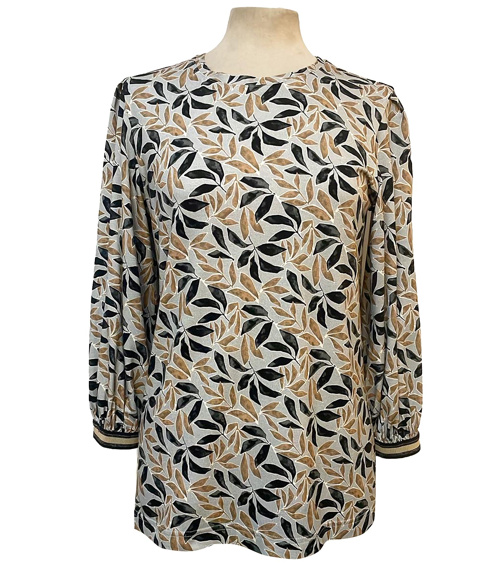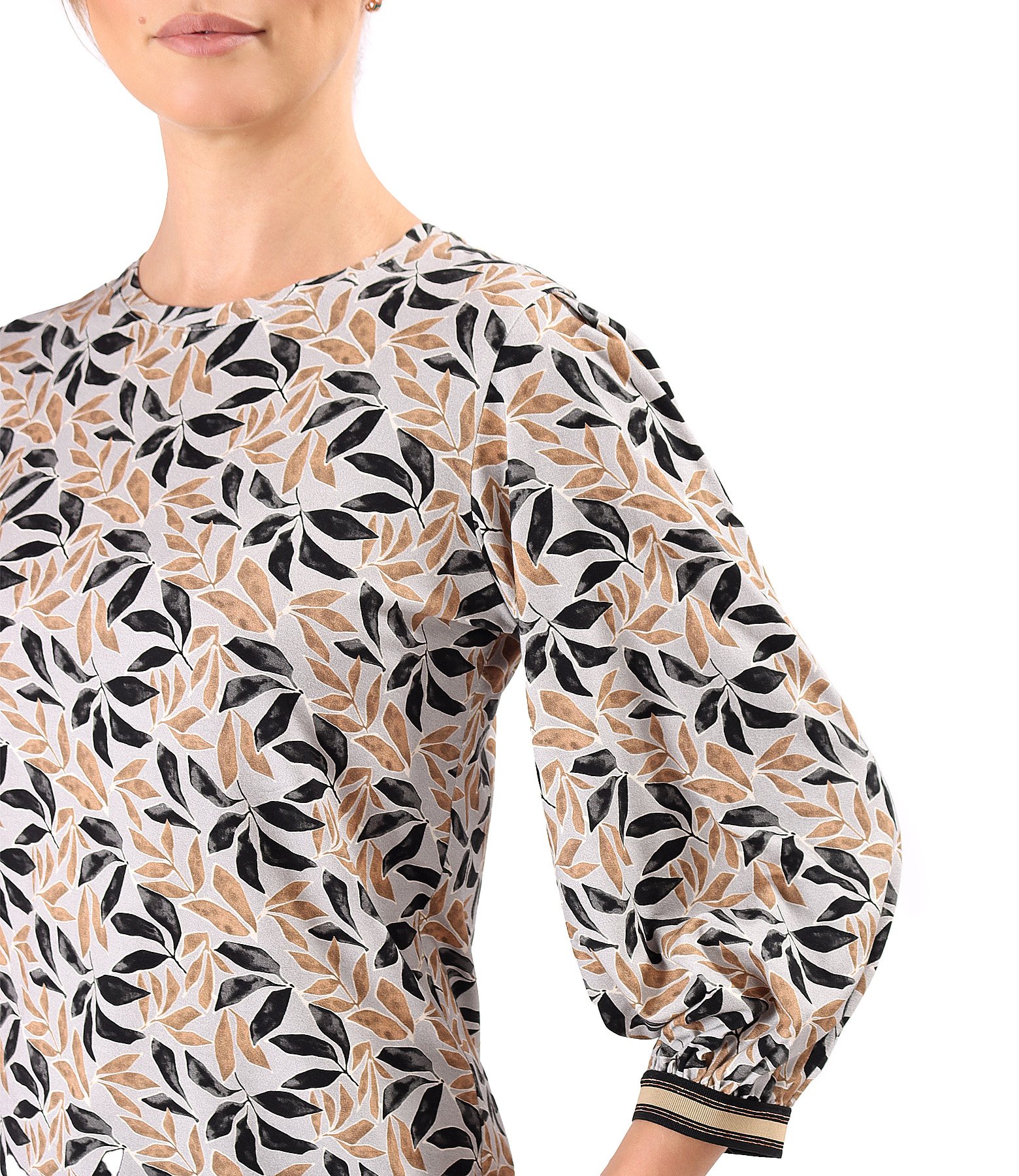 Bluza din jerse elastic imprimat cu motive florale, cu maneci semi-lungi incretite la terminatii, cu banda elastica decorativa si cu decolteu rotund.