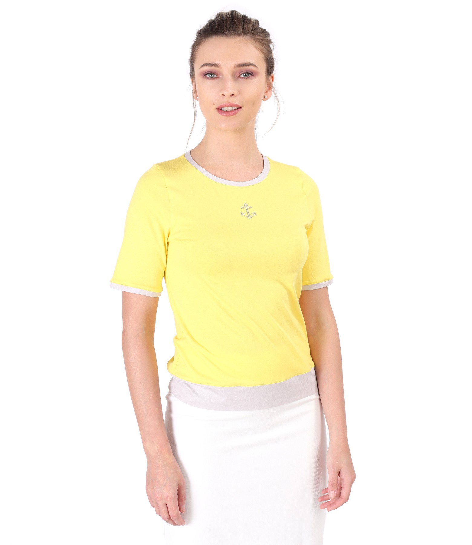 Bluza din jerse elastic uni, cu maneci scurte, ornament lipit pe fata si garnitura la decolteu si terminatie maneci.