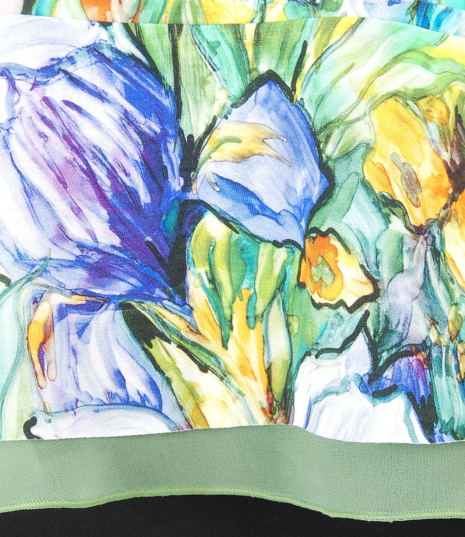 Bluza din jerse elastic cu imprimeu floral, decolteu in V, maneci scurte si volan asimetric in talie dublat cu voal.