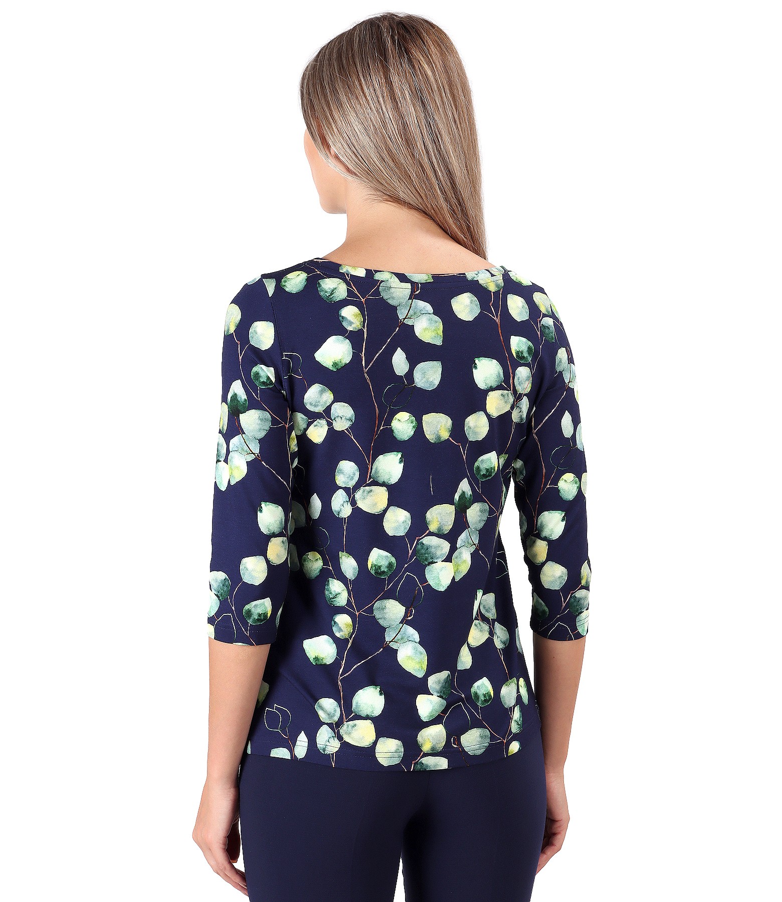 Bluza din jerse elastic din viscoza, imprimat cu motive florale, cu decolteu rotund si maneci 3/4.