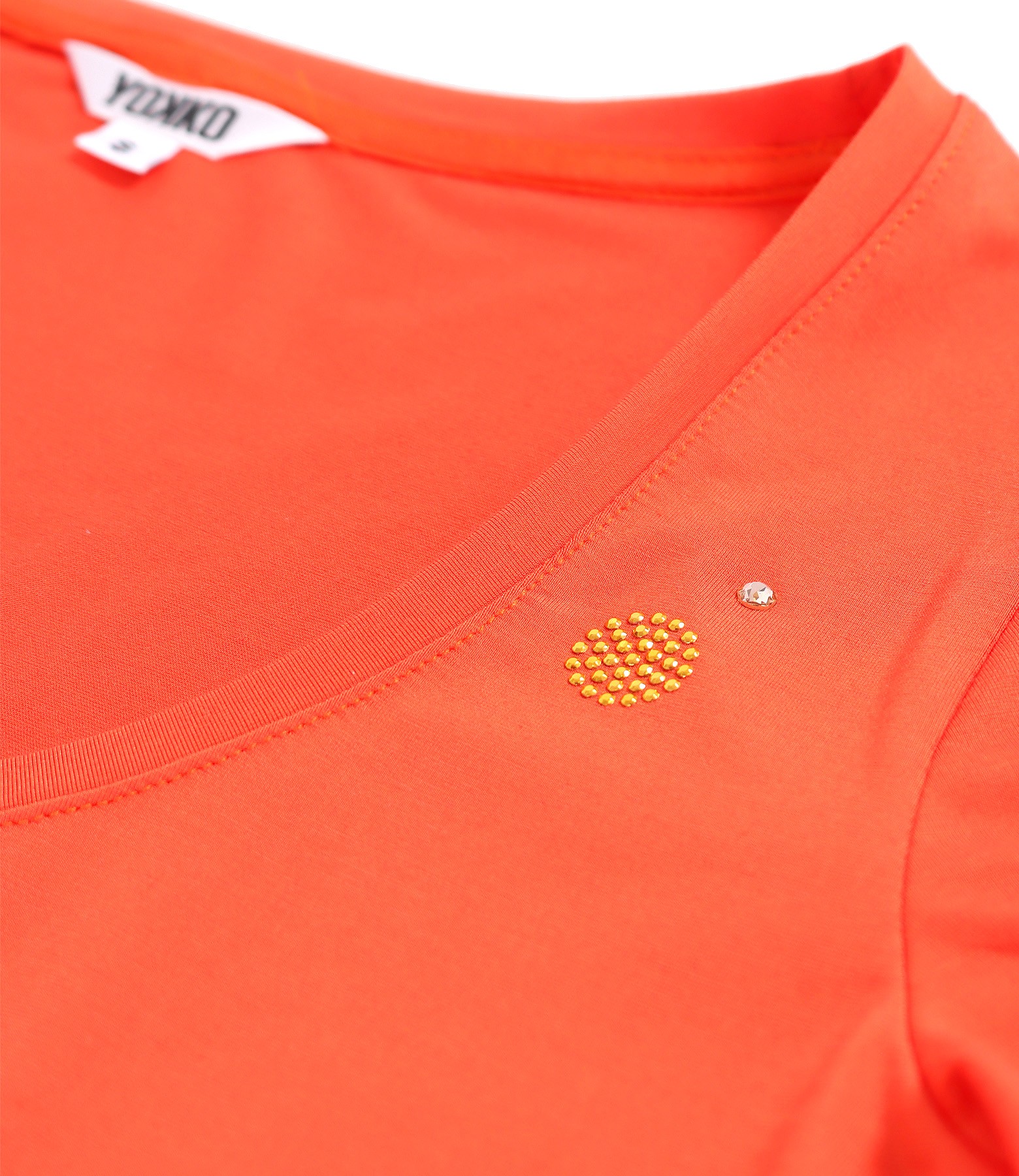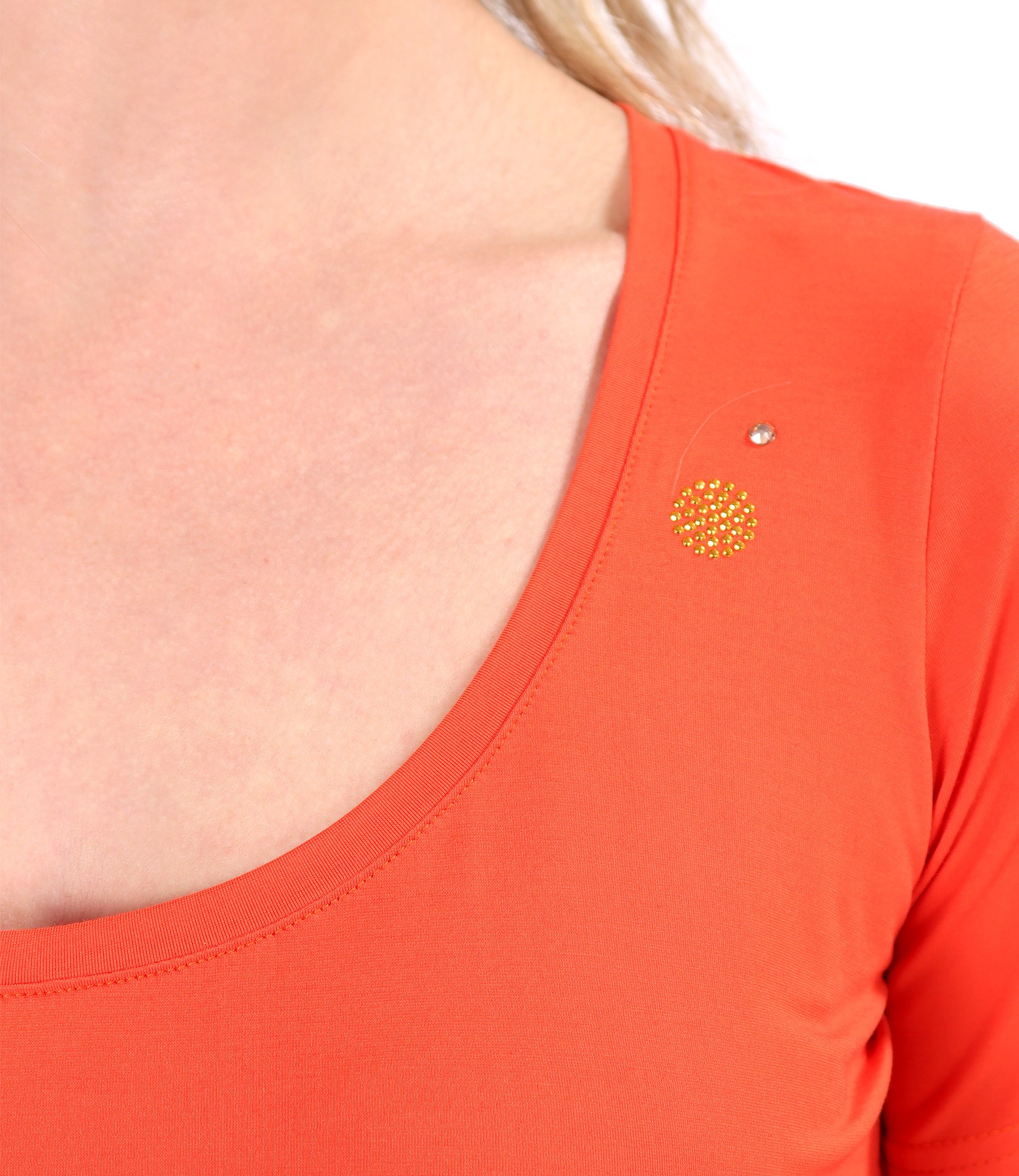 Bluza din jerse elastic de viscoza uni, cu maneci scurte si cu decolteu rotund cu aplicatie decorativa.