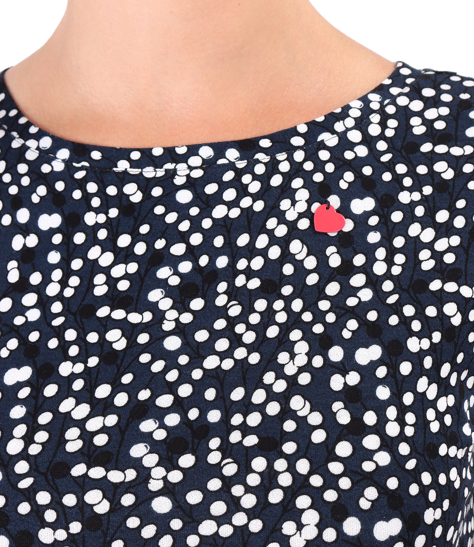 Bluza din jerse elastic din viscoza, imprimat cu picouri si crengute, cu decolteu barcuta cu inima metalica cusuta pe fata si cu umeri cazuti.