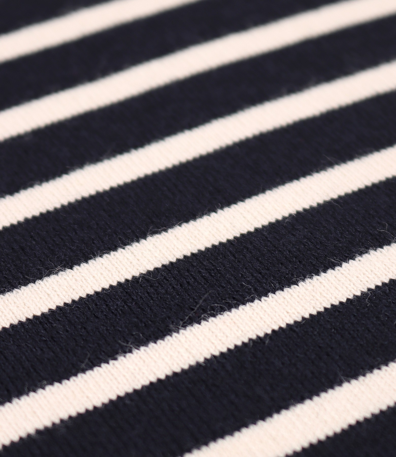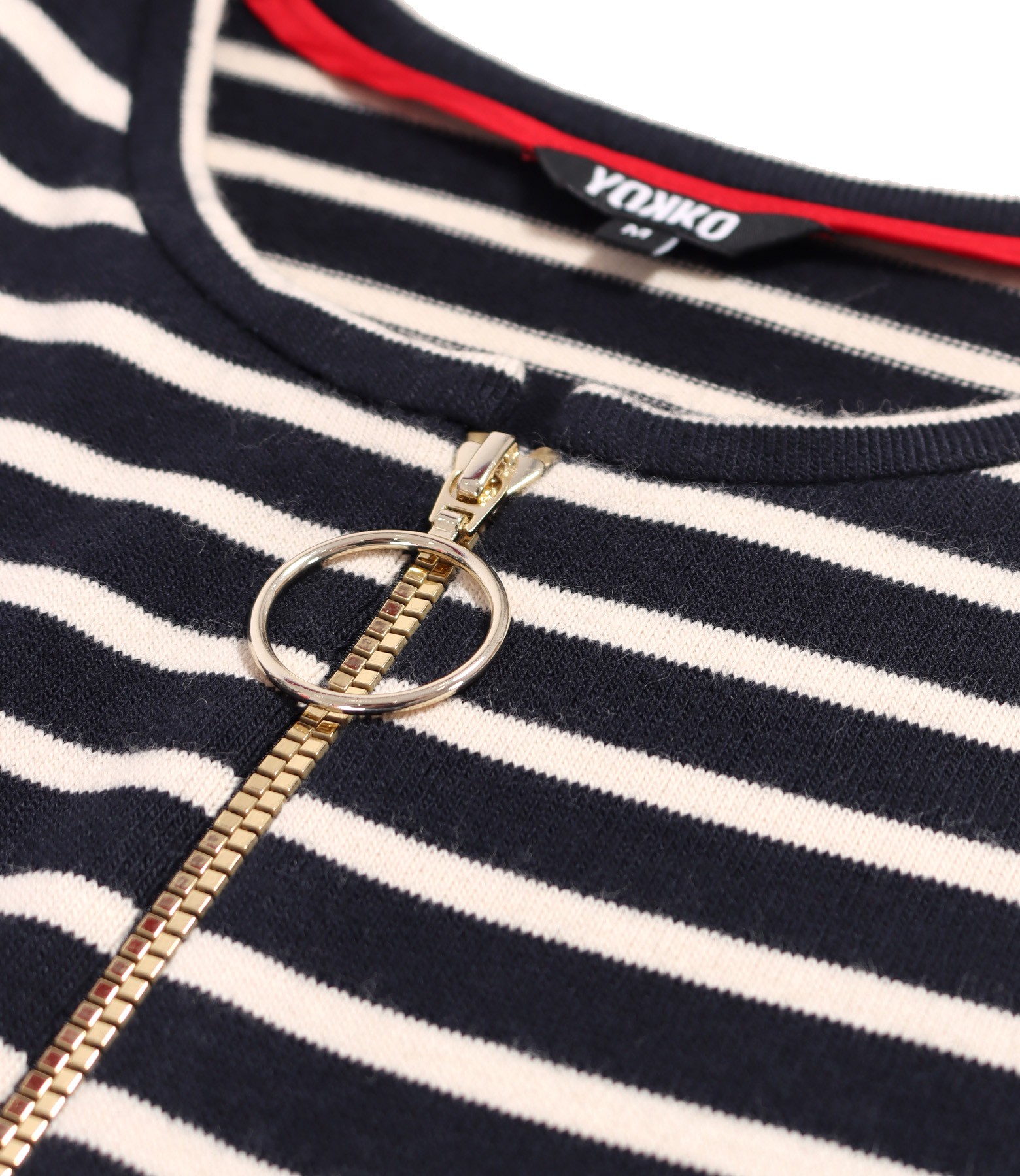 Bluza din jerse elastic gros cu lana si fermoar pe fata, imprimat cu dungi navy, cu decolteu rotund si cu maneci lungi.