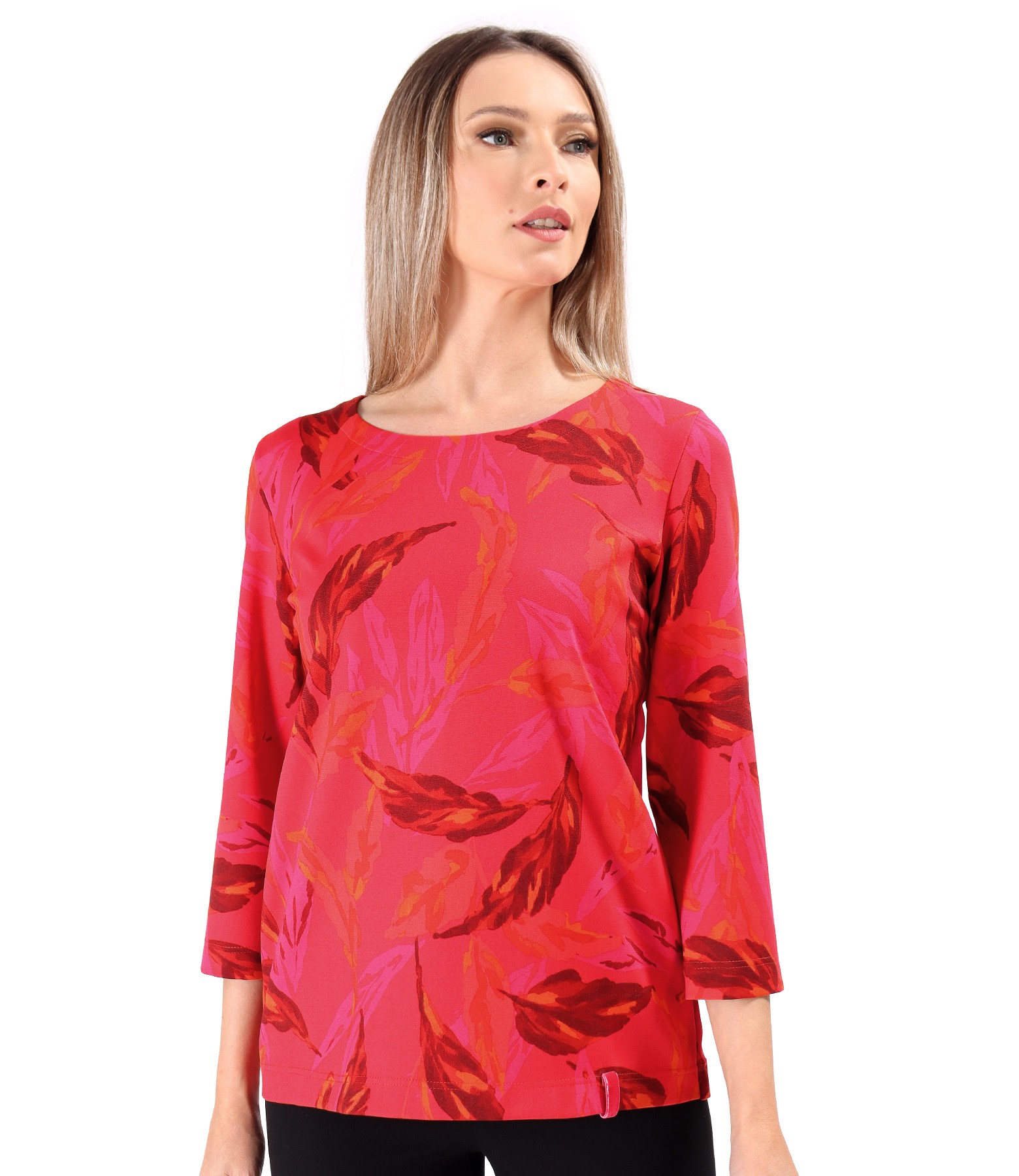 Bluza din jerse elastic gros imprimat cu motive florale, cu maneci 3/4 si decolteu rotund. Pozitia imprimeului variaza per produs.