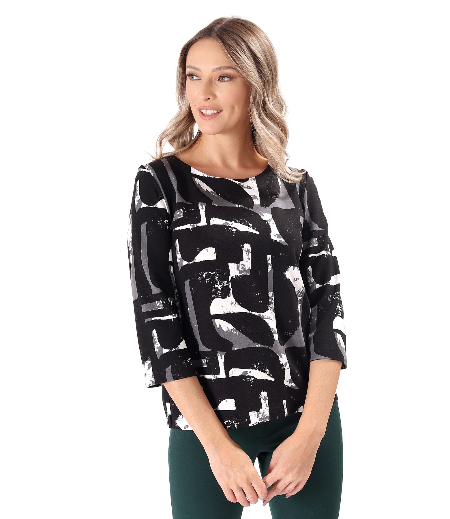 Bluza din jerse elastic gros imprimat cu motive geometrice, cu maneci 3/4 si decolteu rotund. Pozitia imprimeului variaza per produs.
