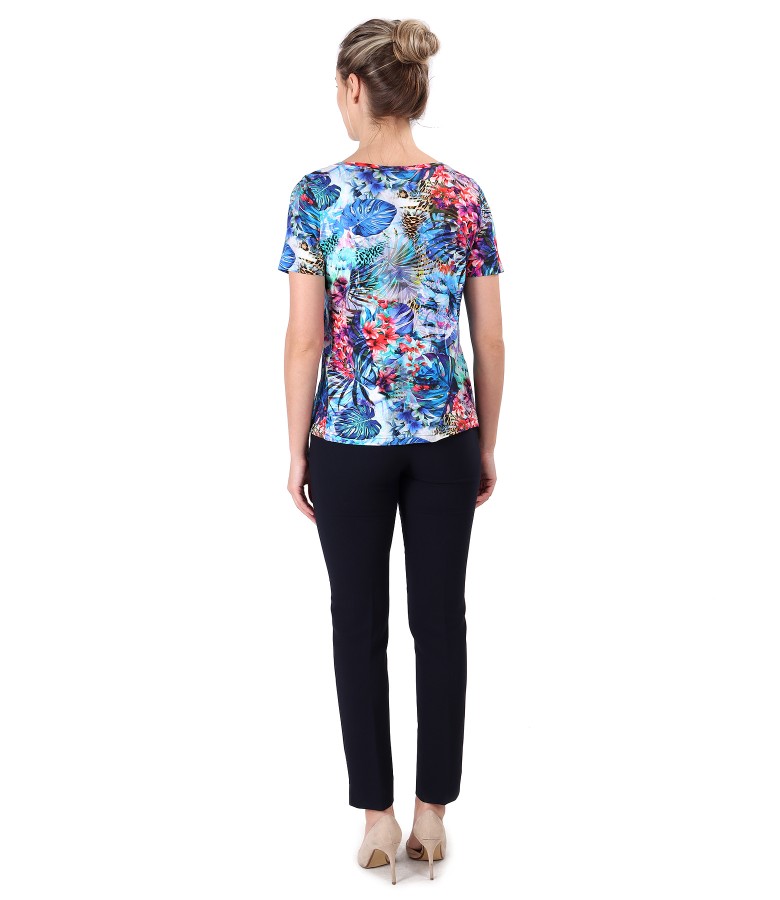 Bluza din jerse elastic imprimat cu flori si pantaloni pana