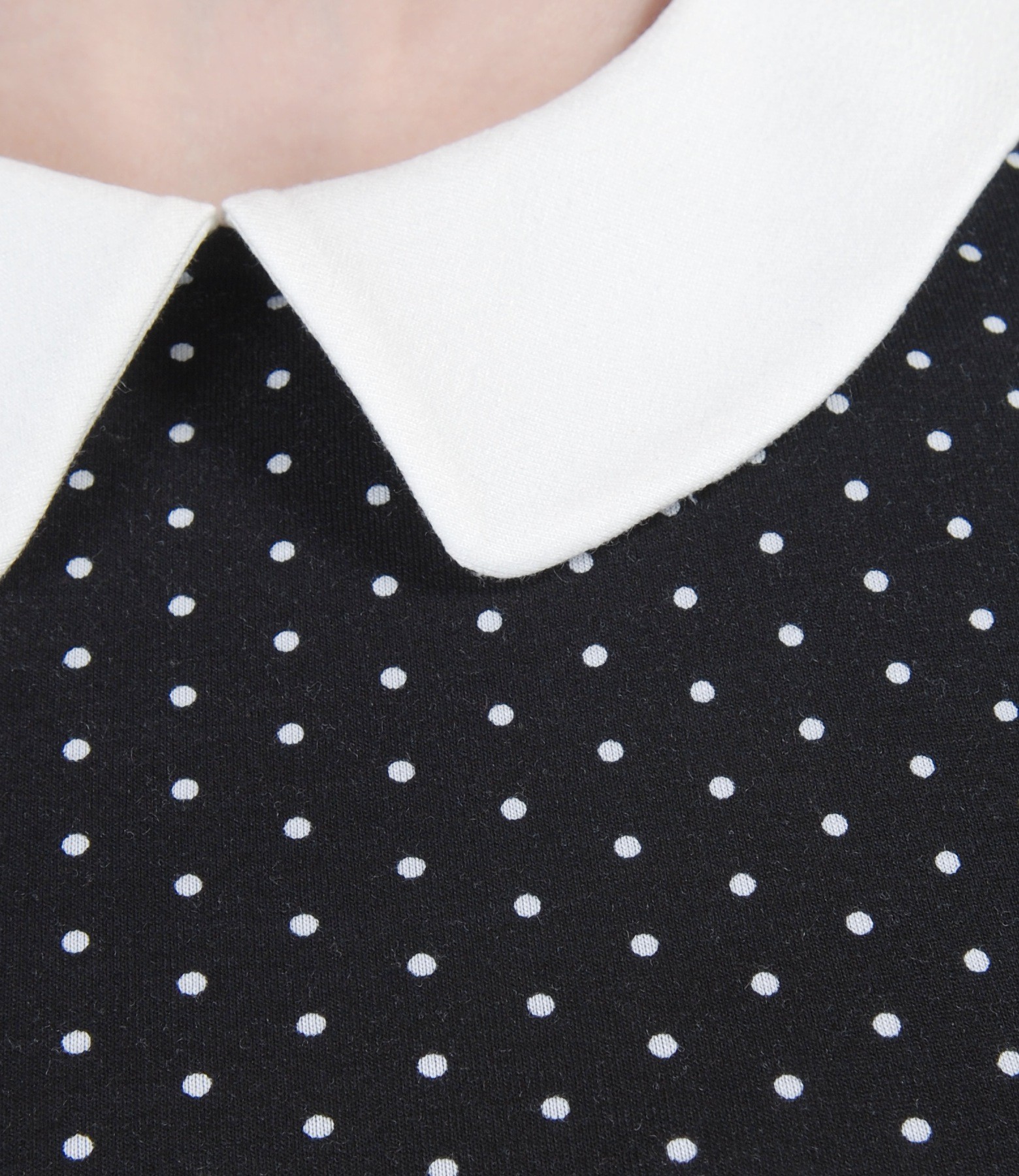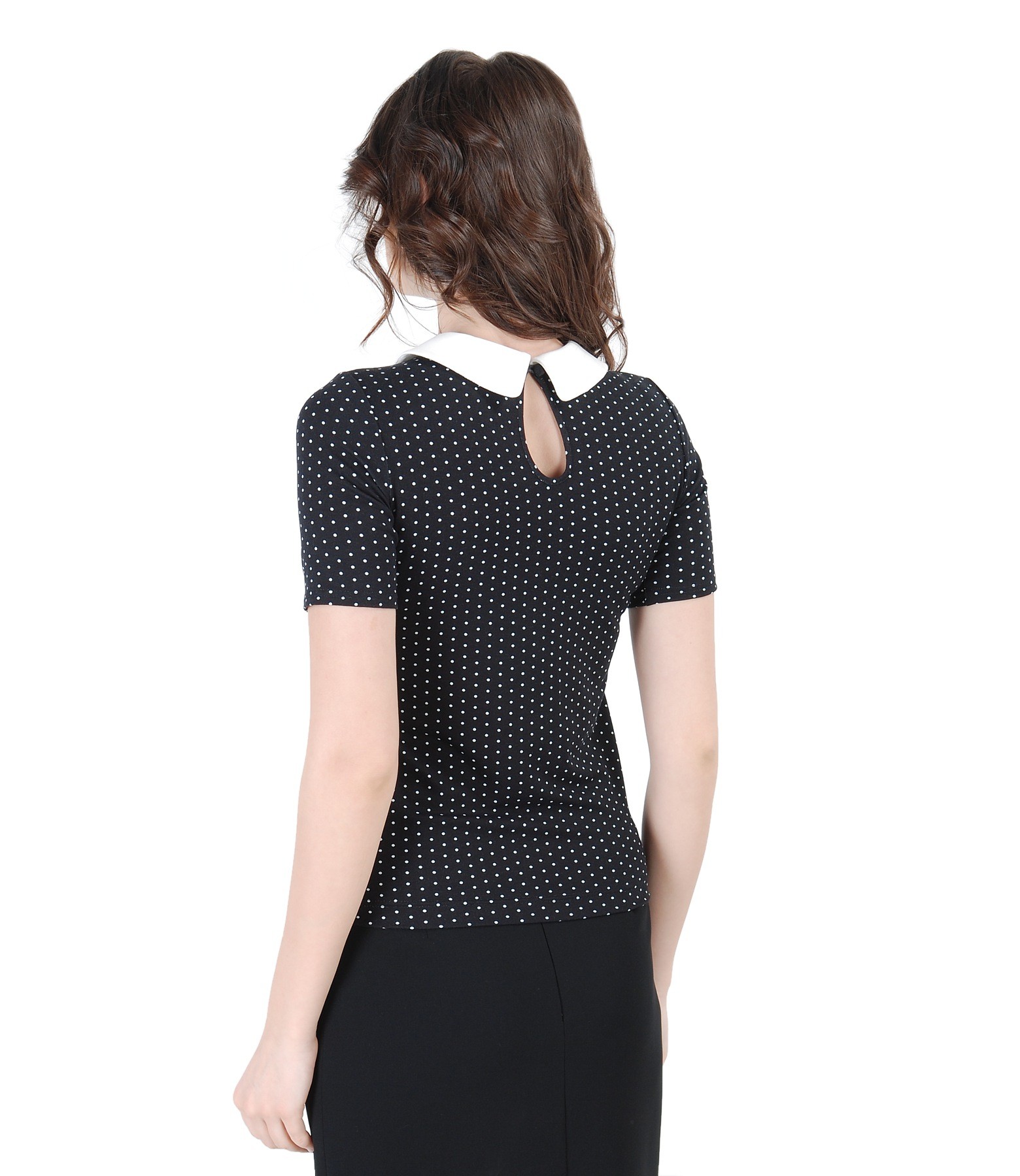 Tricou din jerse elastic imprimat cu buline, cu guler rotunjit din tricot. Se inchide cu un nasture pe spate.