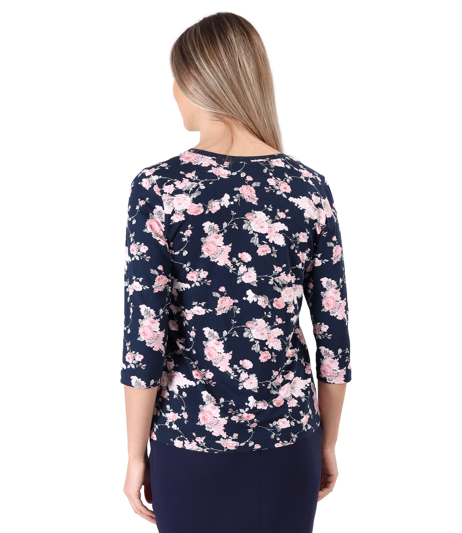 Bluza din jerse elastic subtire de viscoza, imprimat cu motive florale, cu maneci 3/4 si cu decolteu in V.