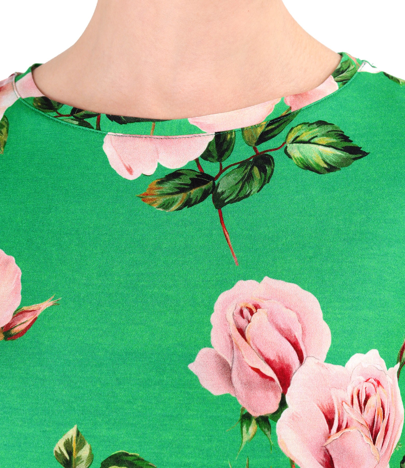 Bluza din jerse elastic din viscoza, imprimat cu motive florale supradimensionate, cu decolteu rotund si maneci 3/4. Pozitia imprimeului variaza per produs.