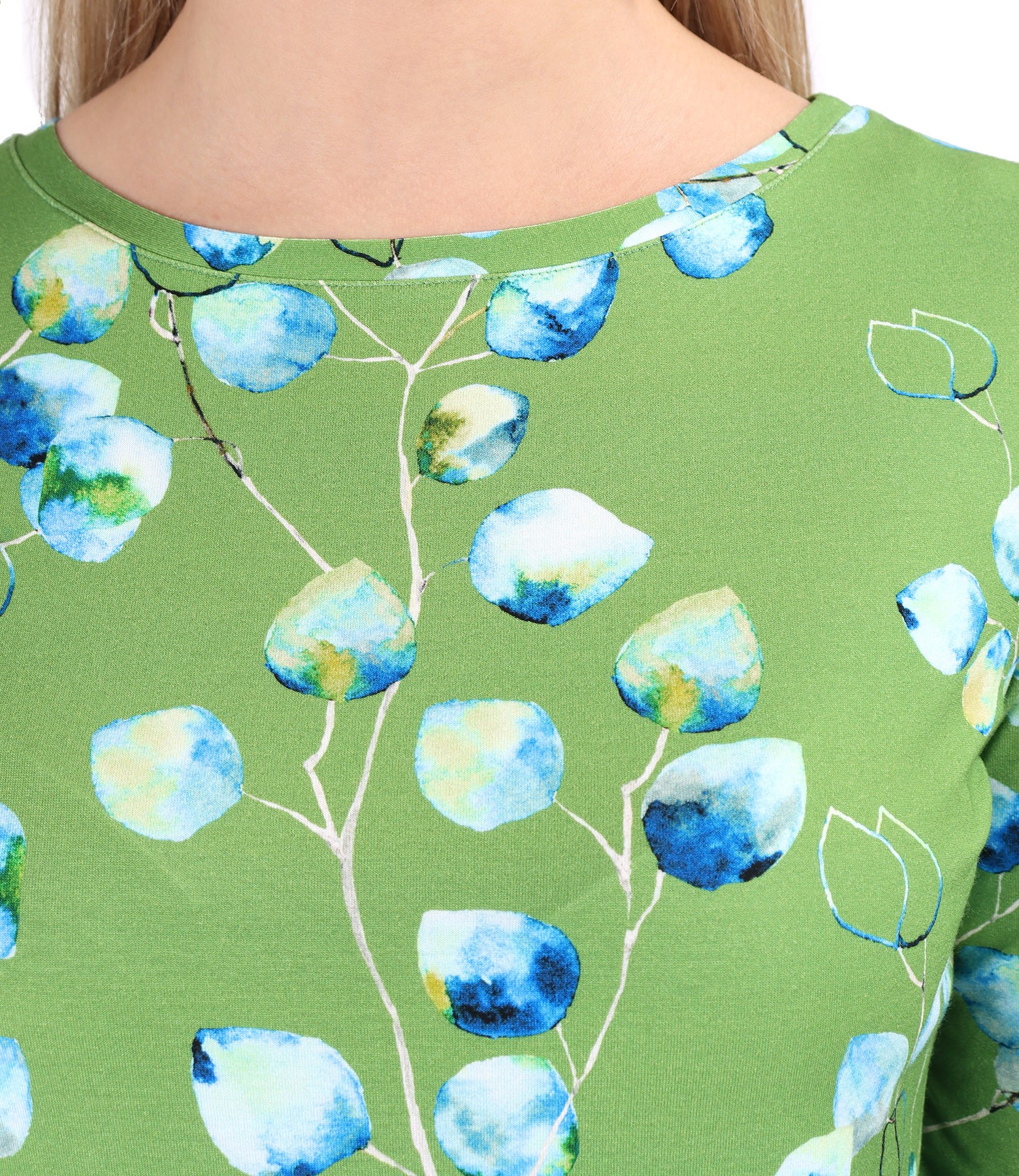 Bluza din jerse elastic din viscoza, imprimat cu motive florale, cu decolteu rotund si maneci 3/4.