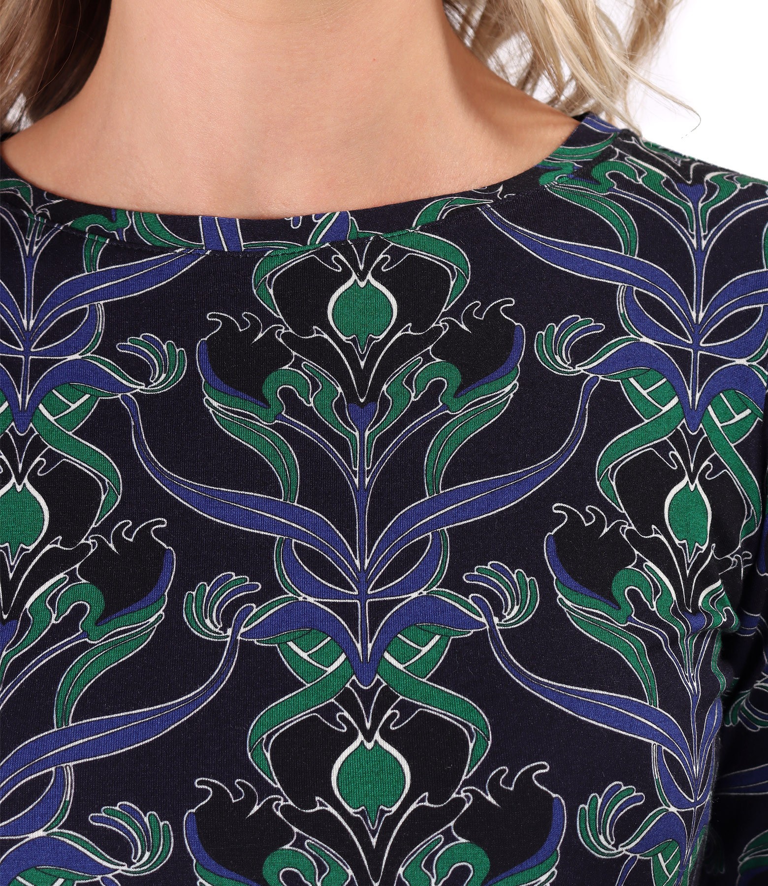 Bluza din jerse elastic, imprimat cu motive florale, cu decolteu rotund si maneci 3/4.