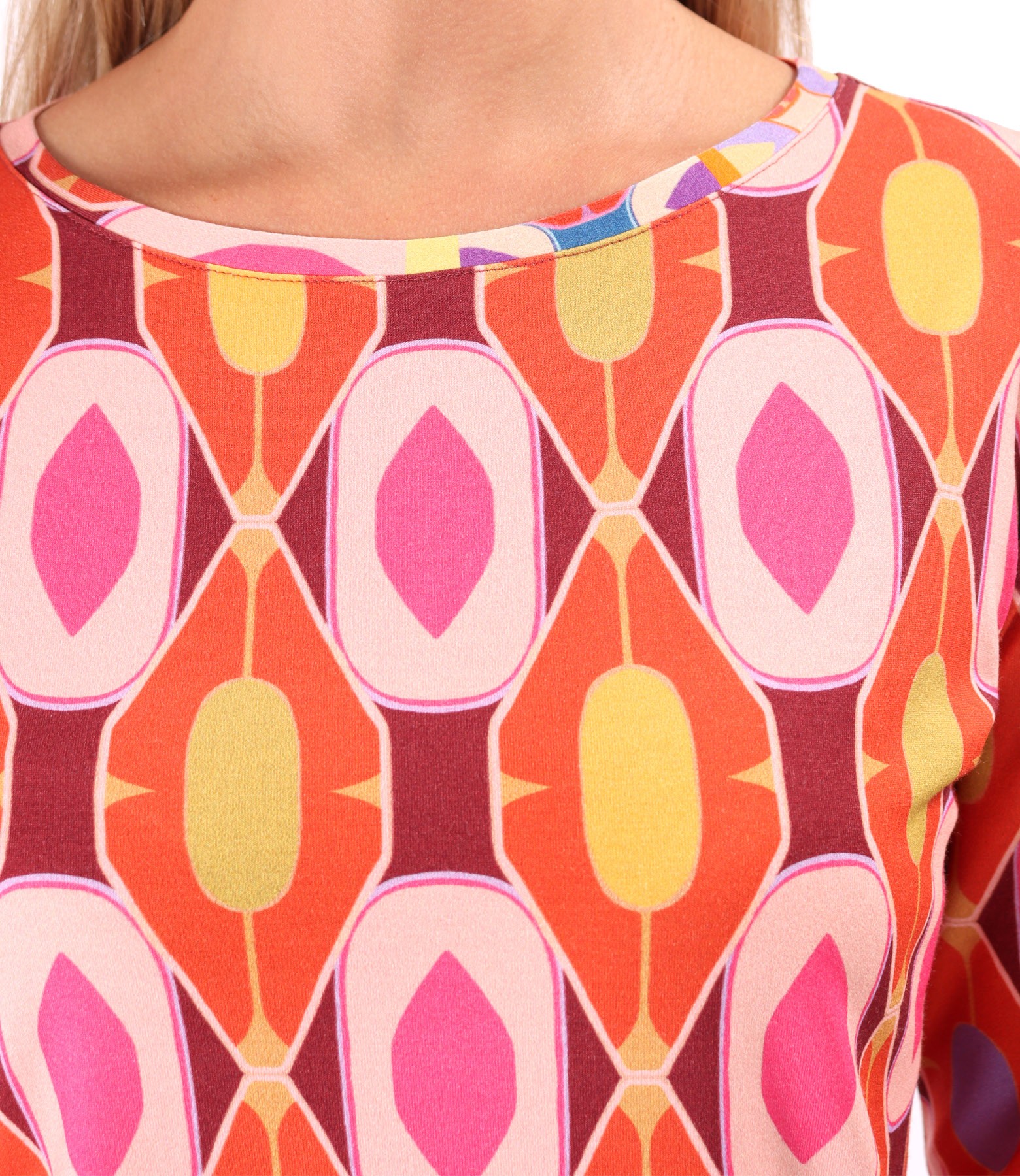 Bluza din jerse elastic din viscoza, imprimat cu motive geometrice, cu decolteu rotund si maneci semi-lungi.