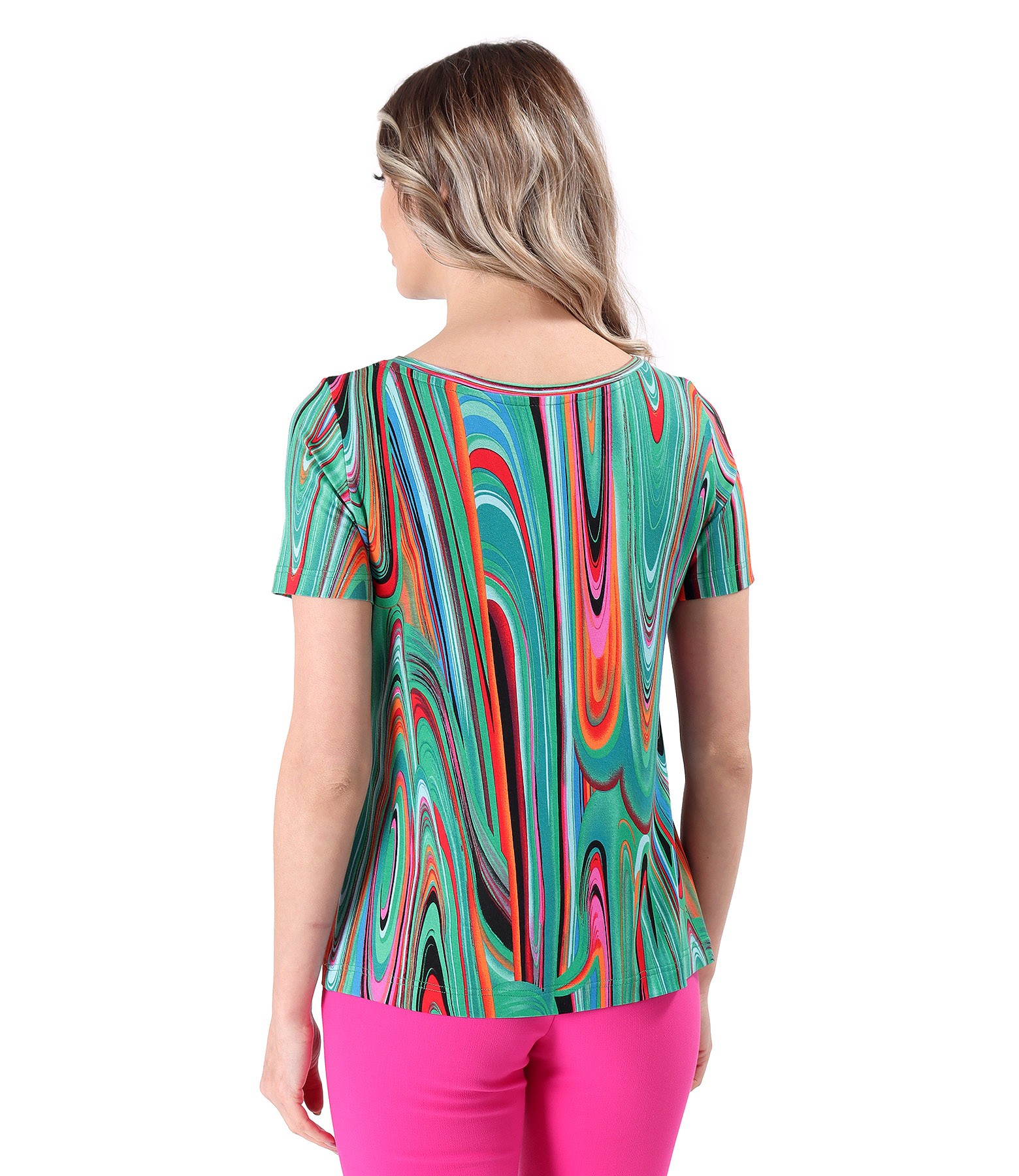 Bluza din jerse elastic de viscoza, imprimat cu motive geometrice, cu decolteu rotund si maneci scurte.