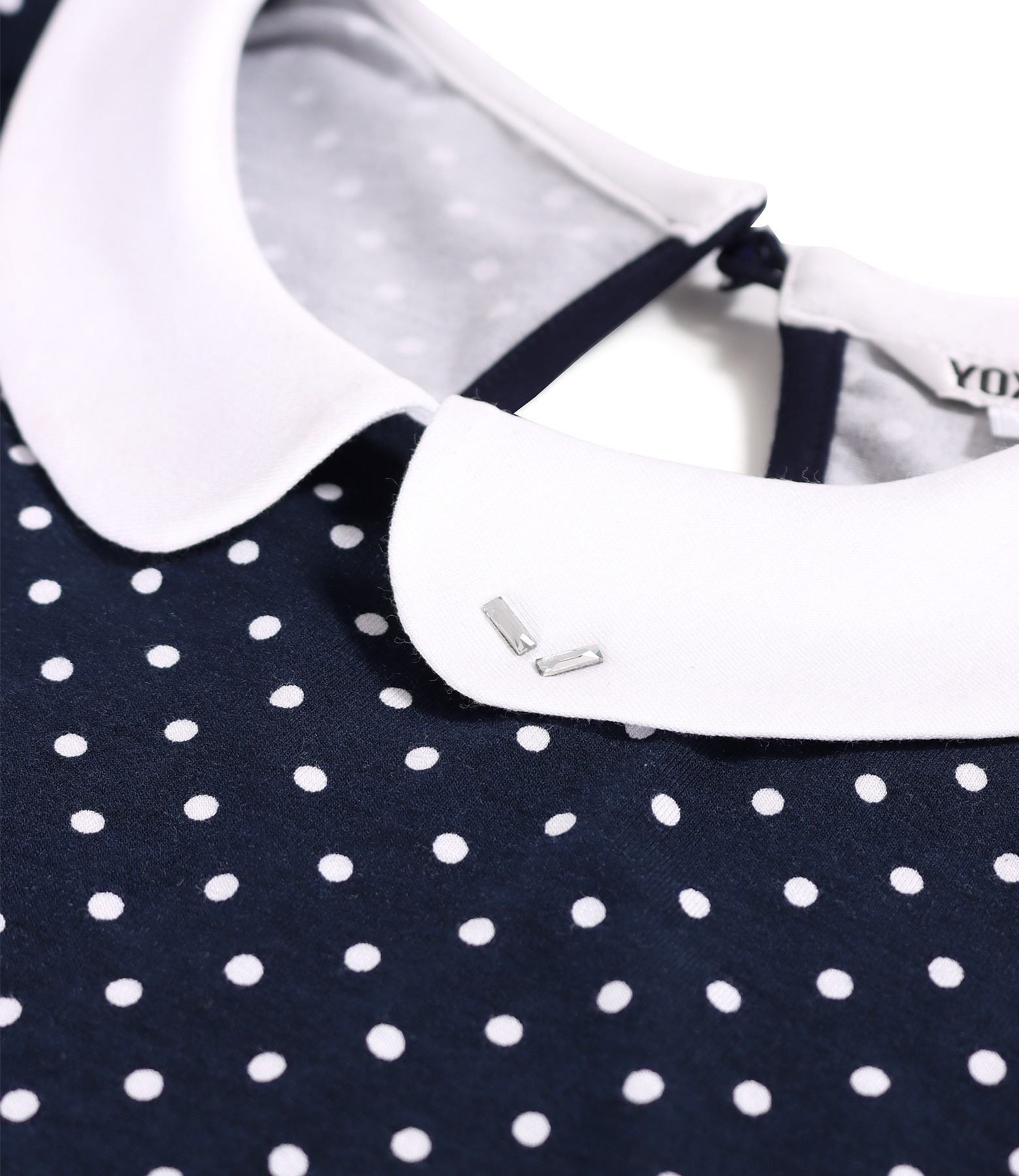 Bluza din jerse elastic imprimat cu picouri cu guler alb, cu maneci scurte si aplicatie de cristale pe guler. Se inchide cu un nasture pe mijloc spate.