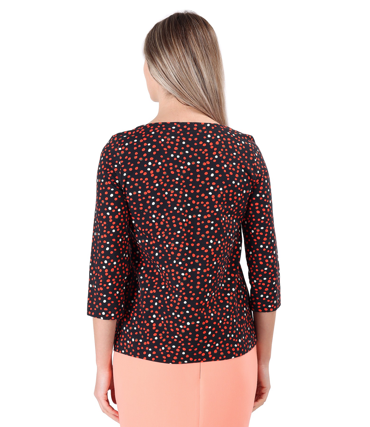 Bluza din jerse elastic imprimat cu picouri, cu maneci 3/4 si cu decolteu rotund.