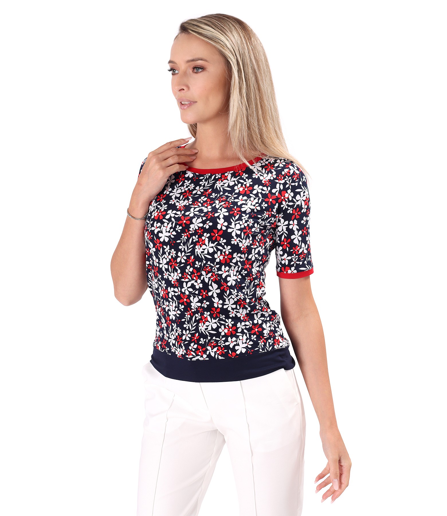 Bluza din jerse elastic imprimat in relief cu motive florale, cu maneci scurte si garnitura in contrast.