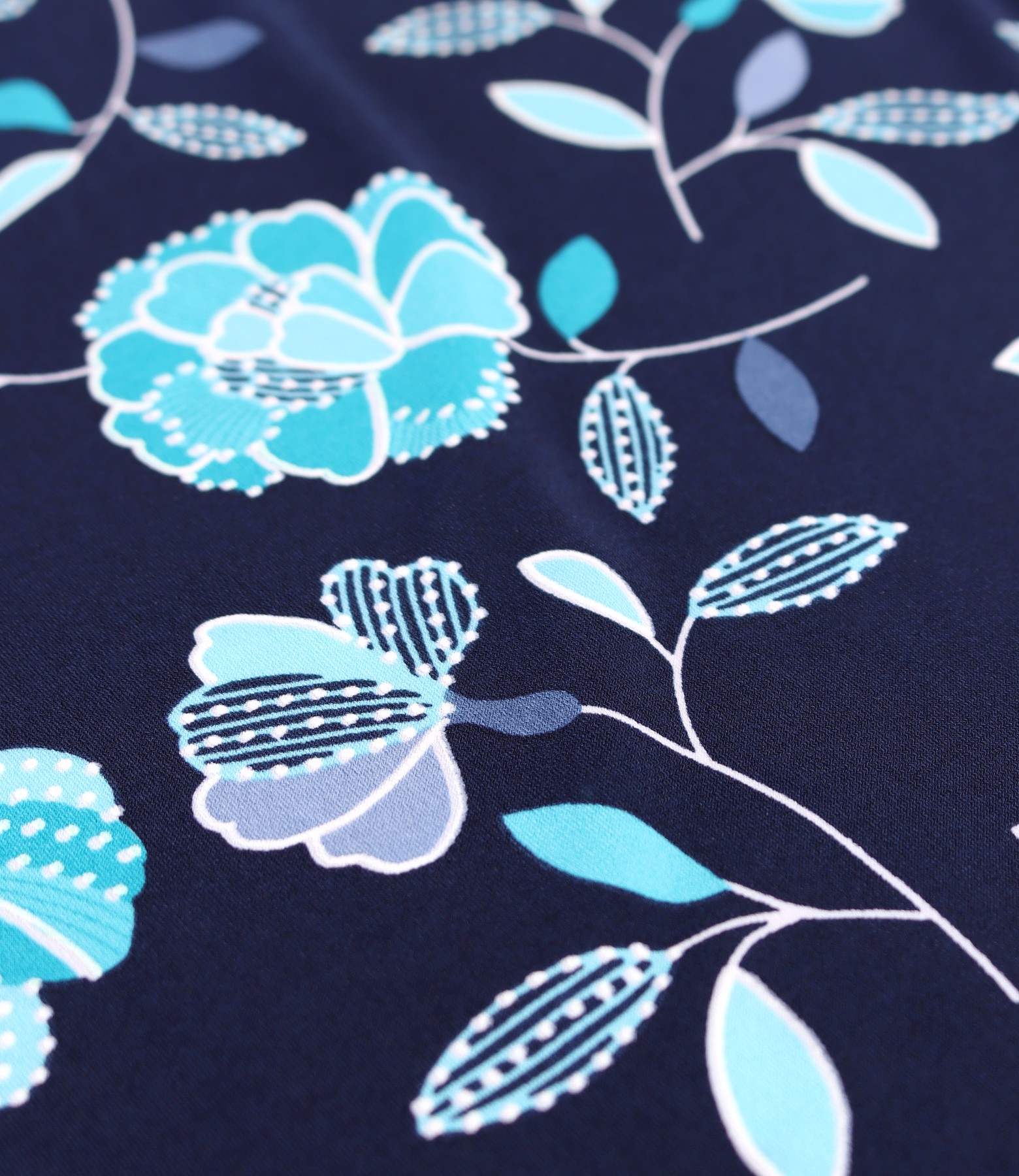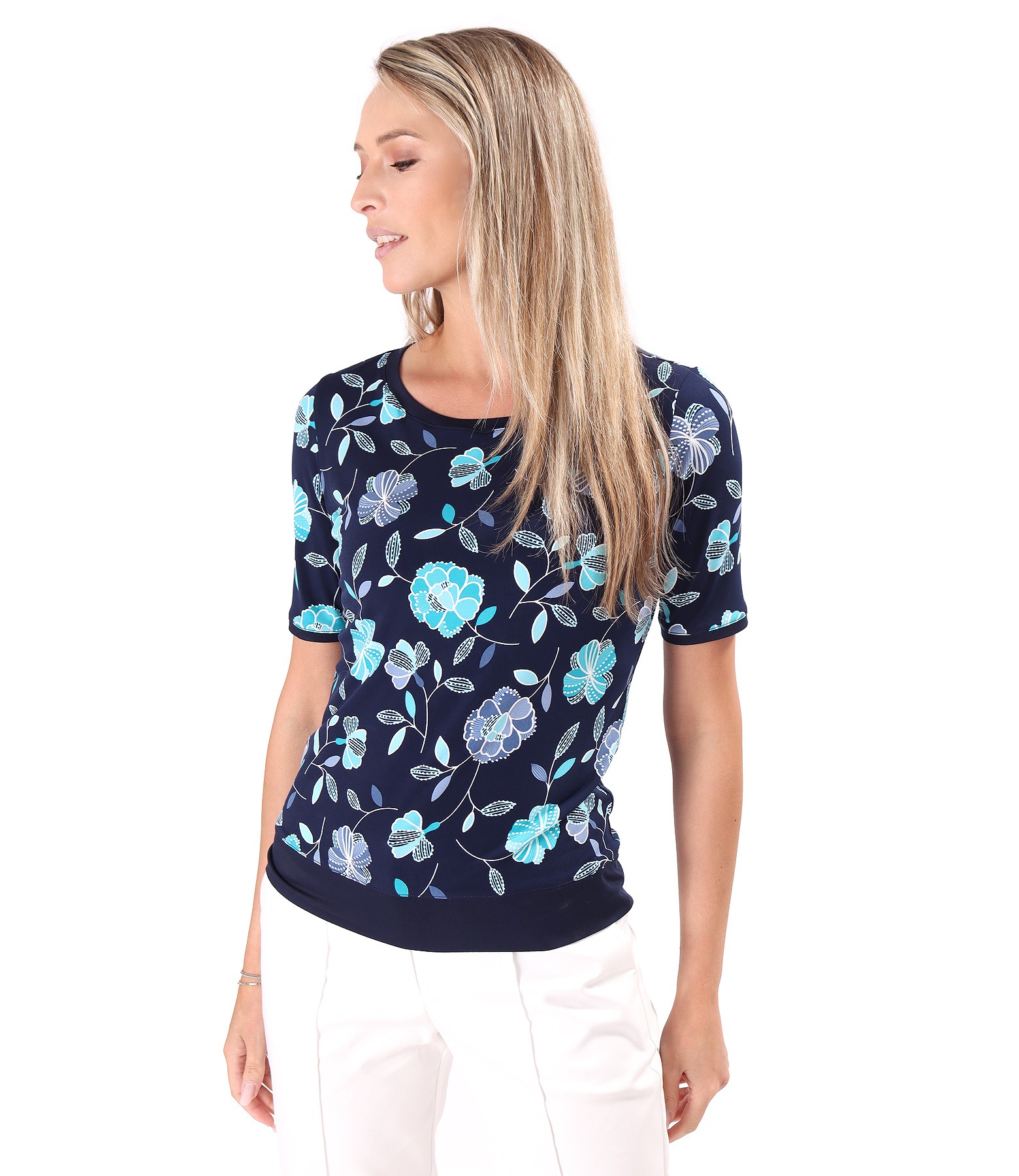 Bluza din jerse elastic imprimat in relief cu motive florale, cu maneci scurte si garnitura in contrast.